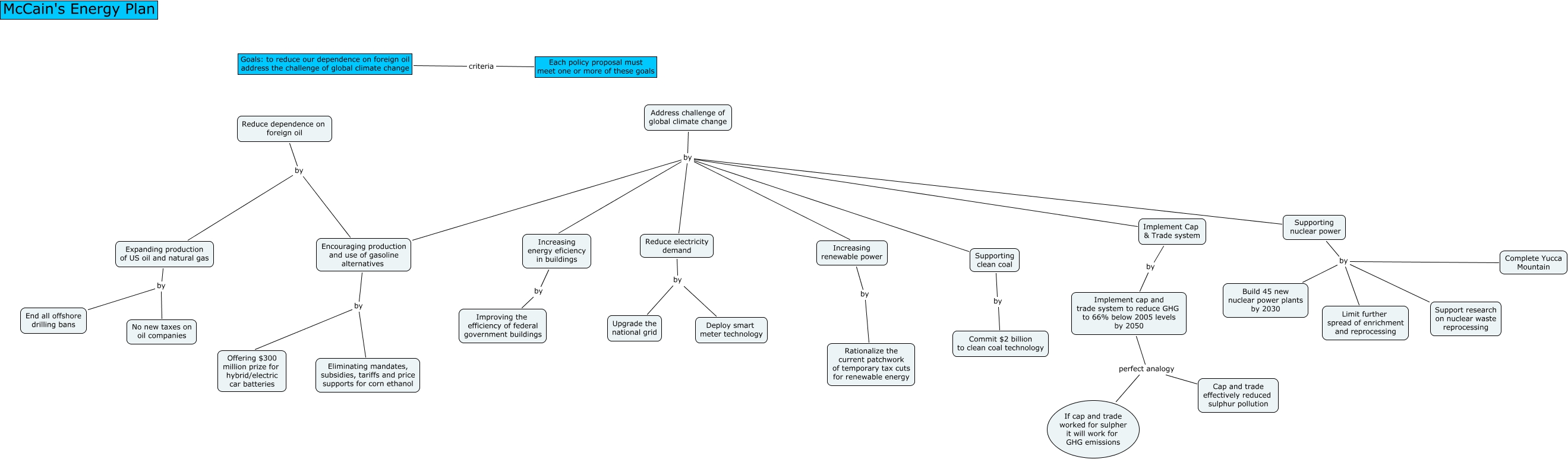 This Concept Map, created with IHMC CmapTools, has information related to: McCain_energy_plan, Address challenge of global climate change by Supporting nuclear power, Expanding production of US oil and natural gas by End all offshore drilling bans, Address challenge of global climate change by Implement Cap & Trade system, Reduce dependence on foreign oil by Encouraging production and use of gasoline alternatives, Address challenge of global climate change by Increasing renewable power, Supporting nuclear power by Build 45 new nuclear power plants by 2030, Supporting clean coal by Commit $2 billion to clean coal technology, Supporting nuclear power by Limit further spread of enrichment and reprocessing, Increasing renewable power by Rationalize the current patchwork of temporary tax cuts for renewable energy, Increasing energy eficiency in buildings by Improving the efficiency of federal government buildings, Cap and trade effectively reduced sulphur pollution perfect analogy Implement cap and trade system to reduce GHG to 66% below 2005 levels by 2050, If cap and trade worked for sulpher it will work for GHG emissions perfect analogy Implement cap and trade system to reduce GHG to 66% below 2005 levels by 2050, Supporting nuclear power by Support research on nuclear waste reprocessing, Encouraging production and use of gasoline alternatives by Offering $300 million prize for hybrid/electric car batteries, Address challenge of global climate change by Supporting clean coal, Expanding production of US oil and natural gas by No new taxes on oil companies, Address challenge of global climate change by Reduce electricity demand, Implement Cap & Trade system by Implement cap and trade system to reduce GHG to 66% below 2005 levels by 2050, Reduce electricity demand by Deploy smart meter technology, Encouraging production and use of gasoline alternatives by Eliminating mandates, subsidies, tariffs and price supports for corn ethanol
