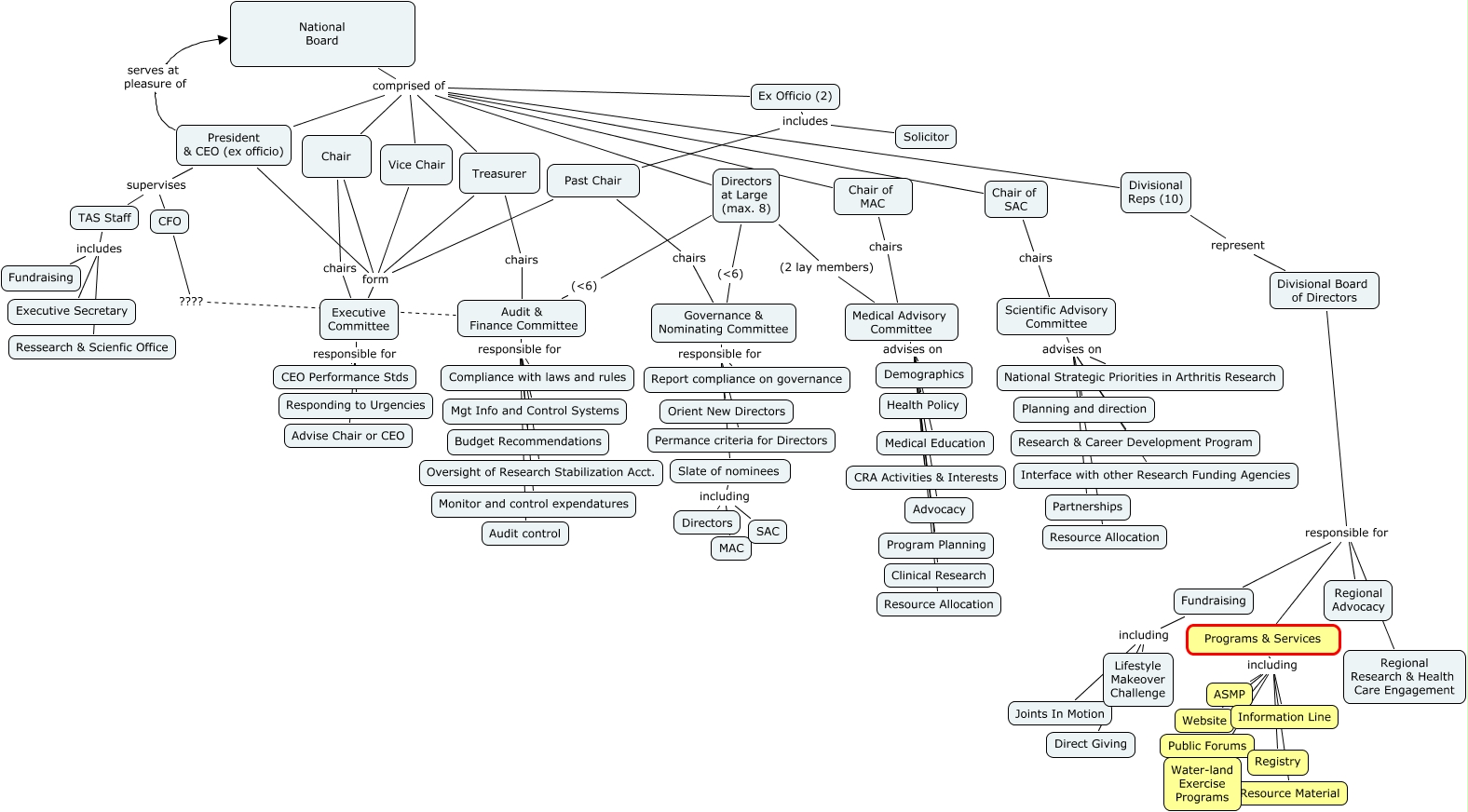 This Concept Map, created with IHMC CmapTools, has information related to: TAS Board Structure2, Medical Advisory Committee advises on Medical Education, Ex Officio (2) comprised of Chair of MAC, Ex Officio (2) comprised of Directors at Large (max. 8), Divisional Board of Directors responsible for Programs & Services, Slate of nominees including Directors, Divisional Reps (10) represent Divisional Board of Directors, Vice Chair form Executive Committee, Past Chair chairs Governance & Nominating Committee, Programs & Services including ASMP, Scientific Advisory Committee advises on Partnerships, Treasurer chairs Audit & Finance Committee, Treasurer form Executive Committee, Programs & Services including Public Forums, Directors at Large (max. 8) (ɞ) Audit & Finance Committee, Past Chair form Executive Committee, Audit & Finance Committee responsible for Compliance with laws and rules, TAS Staff includes Fundraising, Audit & Finance Committee responsible for Oversight of Research Stabilization Acct., Directors at Large (max. 8) (ɞ) Governance & Nominating Committee, Governance & Nominating Committee responsible for Report compliance on governance
