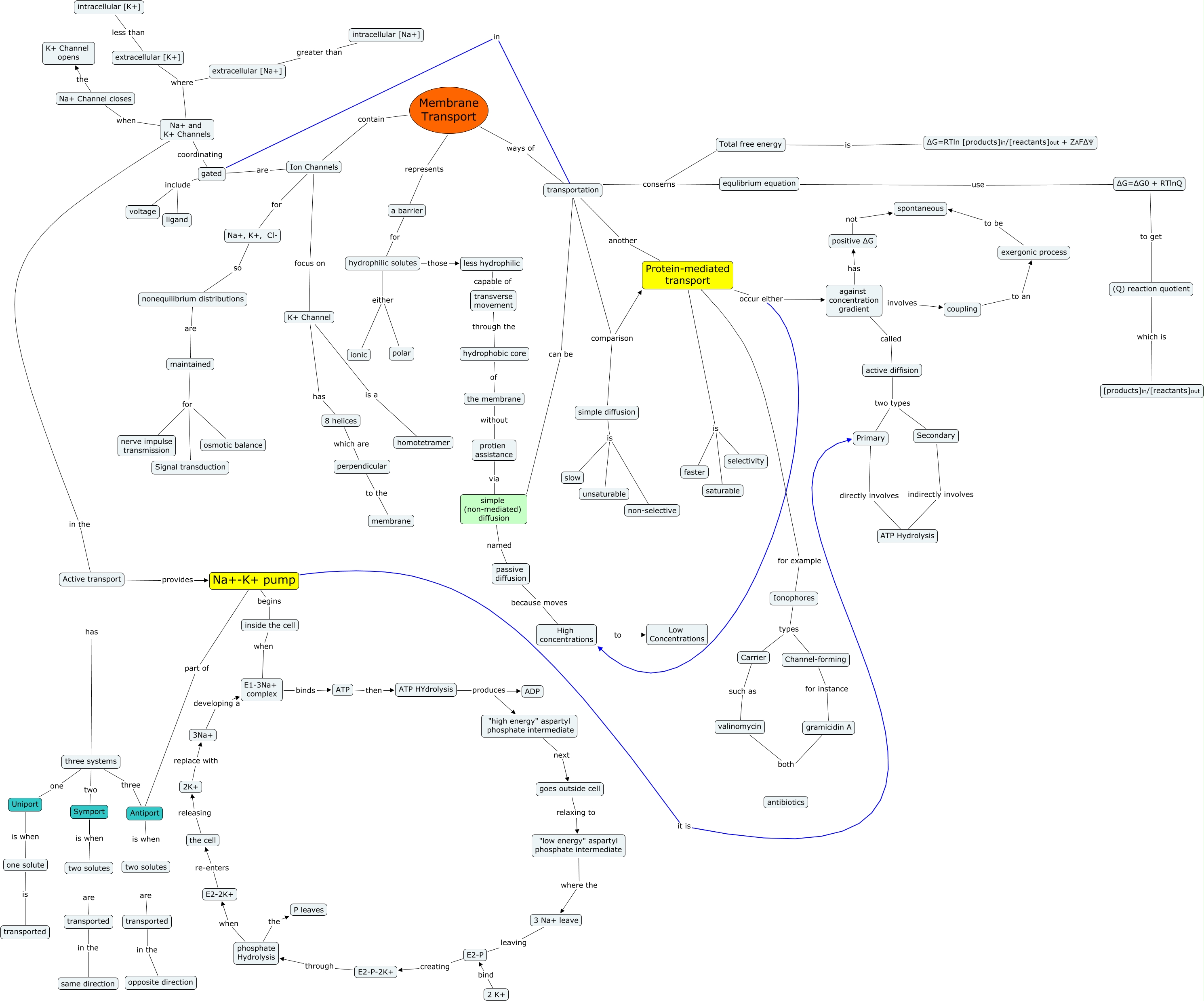 This Concept Map, created with IHMC CmapTools, has information related to: Membrane transport final, K+ Channel is a homotetramer, hydrophobic core of the membrane, Total free energy is ∆G=RTln [products]in/[reactants]out + ZAF∆Ψ, transverse movement through the hydrophobic core, Primary directly involves ATP Hydrolysis, Secondary indirectly involves ATP Hydrolysis, 3 Na+ leave leaving E2-P, simple diffusion is slow, valinomycin both antibiotics, inside the cell when E1-3Na+ complex, phosphate Hydrolysis when E2-2K+, maintained for osmotic balance, transportation conserns equlibrium equation, Ion Channels for Na+, K+, Cl-, transportation conserns Total free energy, transported in the opposite direction, Na+-K+ pump it is Primary, gated include ligand, gramicidin A both antibiotics, Active transport has three systems