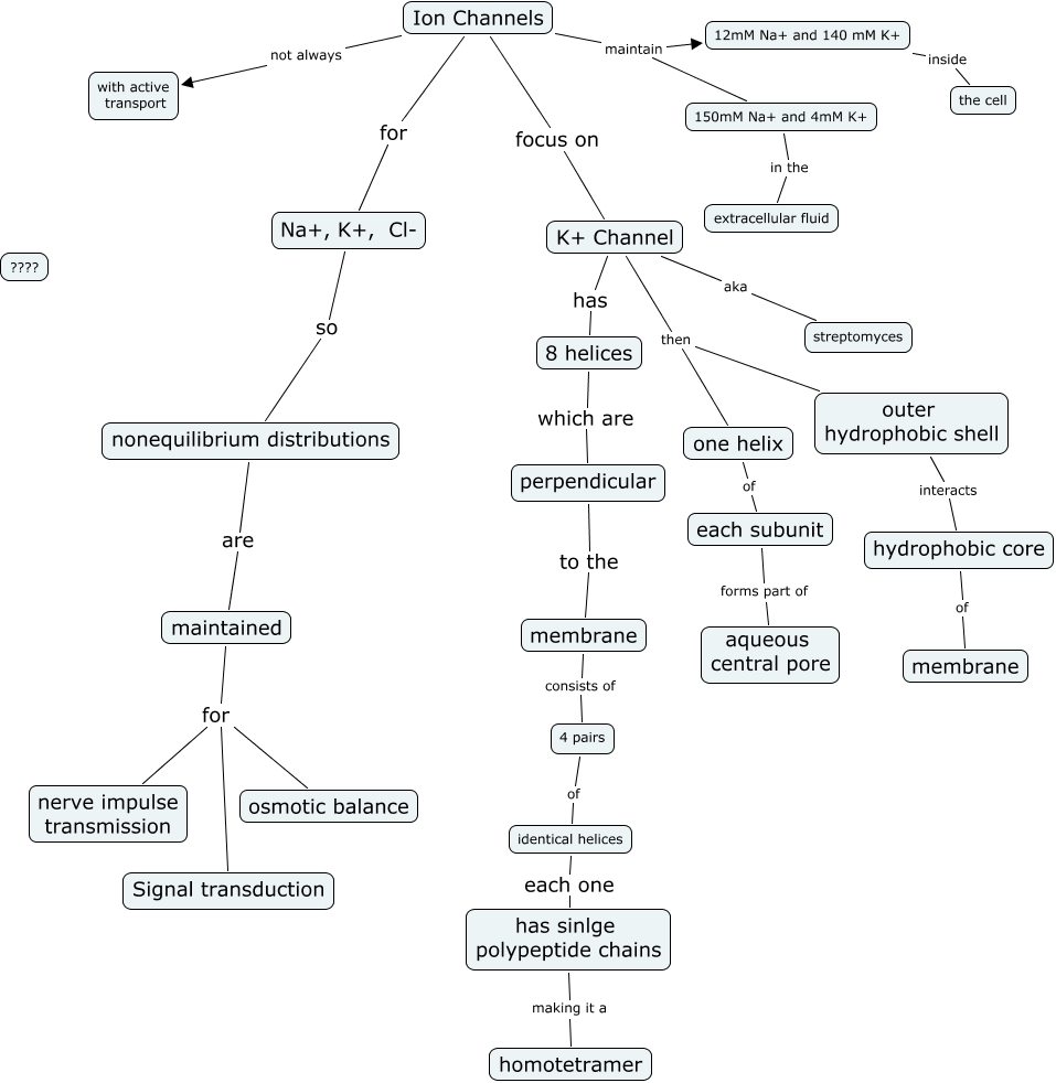 This Concept Map, created with IHMC CmapTools, has information related to: ion channels, maintained for osmotic balance, Ion Channels for Na+, K+, Cl-, 150mM Na+ and 4mM K+ in the extracellular fluid, outer hydrophobic shell interacts hydrophobic core, 4 pairs of identical helices, membrane consists of 4 pairs, maintained for nerve impulse transmission, Na+, K+, Cl- so nonequilibrium distributions, one helix of each subunit, nonequilibrium distributions are maintained, Ion Channels maintain 150mM Na+ and 4mM K+, maintained for Signal transduction, Ion Channels maintain 12mM Na+ and 140 mM K+, Ion Channels focus on K+ Channel, hydrophobic core of membrane, 8 helices which are perpendicular, 12mM Na+ and 140 mM K+ inside the cell, identical helices each one has sinlge polypeptide chains, Ion Channels not always with active transport, has sinlge polypeptide chains making it a homotetramer