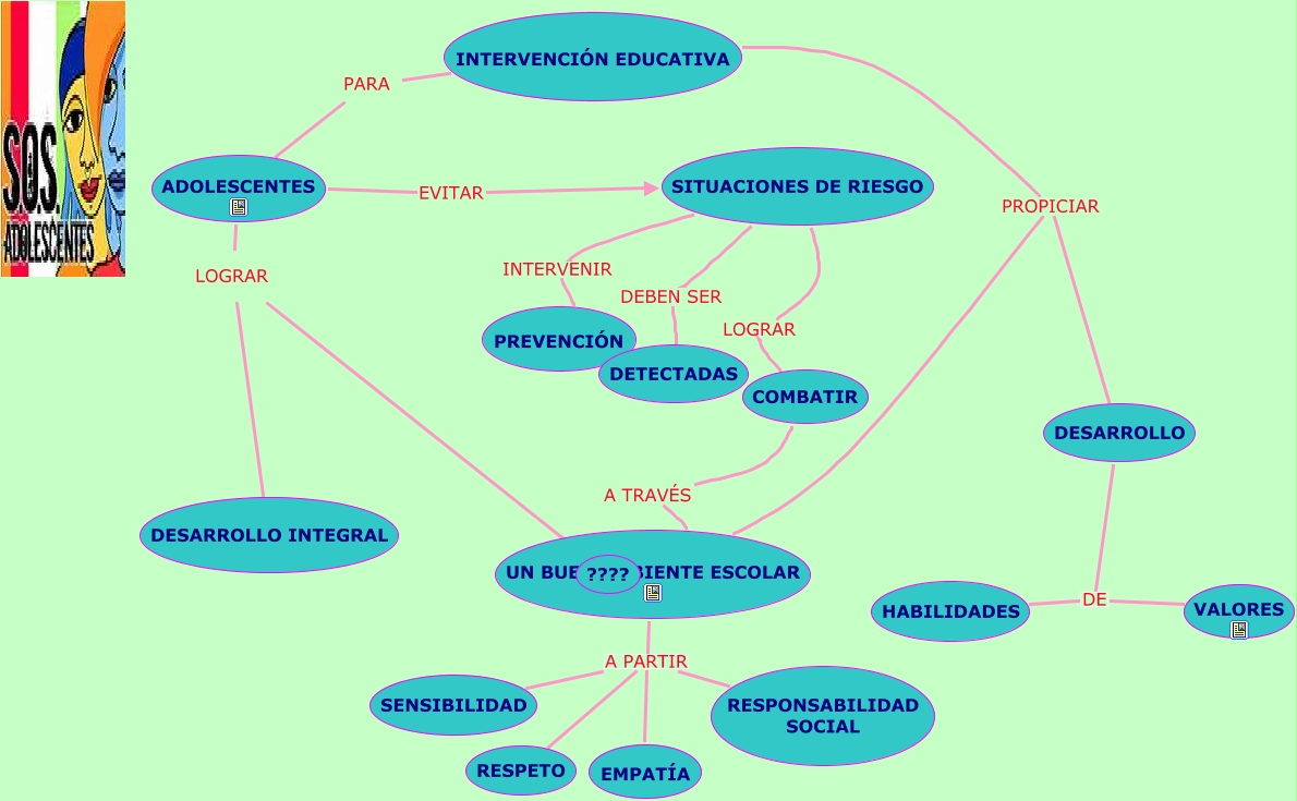 Este Cmap, tiene información relacionada con: Adolescentes en situación en riesgo, INTERVENCIÓN EDUCATIVA PARA ADOLESCENTES, UN BUEN AMBIENTE ESCOLAR A PARTIR RESPONSABILIDAD SOCIAL, COMBATIR A TRAVÉS UN BUEN AMBIENTE ESCOLAR, INTERVENCIÓN EDUCATIVA PROPICIAR DESARROLLO, EMPATÍA A PARTIR RESPONSABILIDAD SOCIAL, SITUACIONES DE RIESGO INTERVENIR PREVENCIÓN, ADOLESCENTES EVITAR SITUACIONES DE RIESGO, DESARROLLO DE HABILIDADES, DESARROLLO DE VALORES, SITUACIONES DE RIESGO LOGRAR COMBATIR, EMPATÍA A PARTIR SENSIBILIDAD, SITUACIONES DE RIESGO DEBEN SER DETECTADAS, EMPATÍA A PARTIR RESPETO, ADOLESCENTES LOGRAR DESARROLLO INTEGRAL, ADOLESCENTES LOGRAR ????, INTERVENCIÓN EDUCATIVA PROPICIAR UN BUEN AMBIENTE ESCOLAR, UN BUEN AMBIENTE ESCOLAR A PARTIR SENSIBILIDAD, UN BUEN AMBIENTE ESCOLAR A PARTIR RESPETO