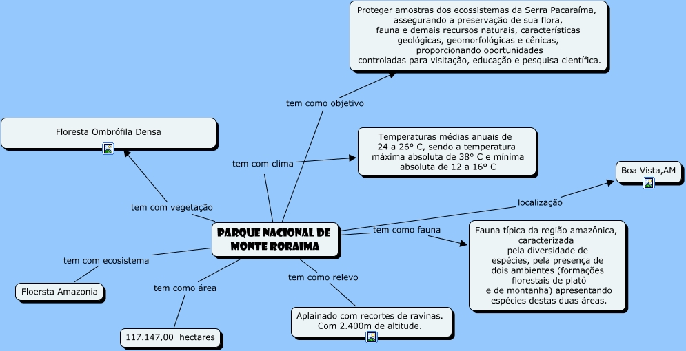gustavo e lulu corrigido, Parque nacional de monte roraima tem com clima Temperaturas médias anuais de 24 a 26° C, sendo a temperatura máxima absoluta de 38° C e mínima absoluta de 12 a 16° C, Parque nacional de monte roraima tem como relevo Aplainado com recortes de ravinas. Com 2.400m de altitude., Parque nacional de monte roraima tem como objetivo Proteger amostras dos ecossistemas da Serra Pacaraíma, assegurando a preservação de sua flora, fauna e demais recursos naturais, características geológicas, geomorfológicas e cênicas, proporcionando oportunidades controladas para visitação, educação e pesquisa científica., Parque nacional de monte roraima tem com ecosistema Floersta Amazonia, Parque nacional de monte roraima tem como área 117.147,00 hectares, Parque nacional de monte roraima tem como fauna Fauna típica da região amazônica, caracterizada pela diversidade de espécies, pela presença de dois ambientes (formações florestais de platô e de montanha) apresentando espécies destas duas áreas., Parque nacional de monte roraima tem com vegetação Floresta Ombrófila Densa, Parque nacional de monte roraima localização Boa Vista,AM