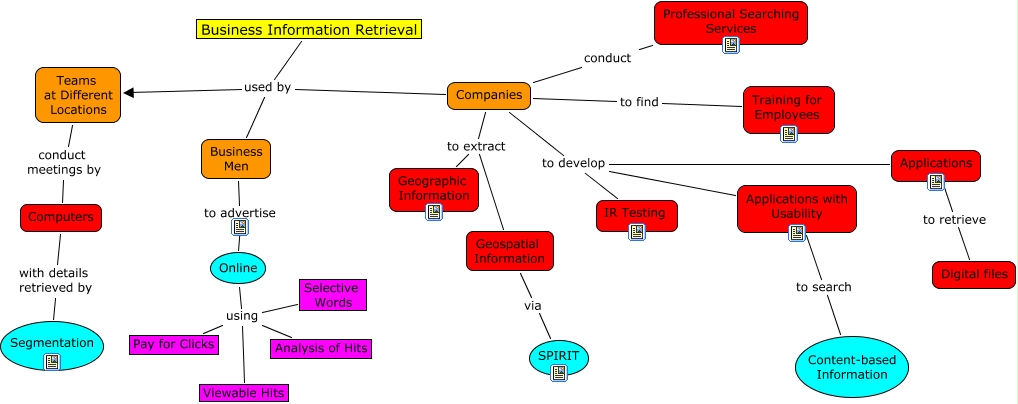This Concept Map, created with IHMC CmapTools, has information related to: Information Retrieval in Business, Companies to extract Geospatial Information, Geospatial Information via SPIRIT, Business Information Retrieval used by Business Men, Applications to retrieve Digital files, Companies to develop IR Testing, Applications with Usability to search Content-based Information, Online using Viewable Hits, Business Information Retrieval used by Companies, Companies conduct Professional Searching Services, Online using Analysis of Hits, Business Men to advertise Online, Companies to develop Applications with Usability, Companies to find Training for Employees, Business Information Retrieval used by Teams at Different Locations, Online using Pay for Clicks, Computers with details retrieved by Segmentation, Teams at Different Locations conduct meetings by Computers, Online using Selective Words, Companies to extract Geographic Information, Companies to develop Applications