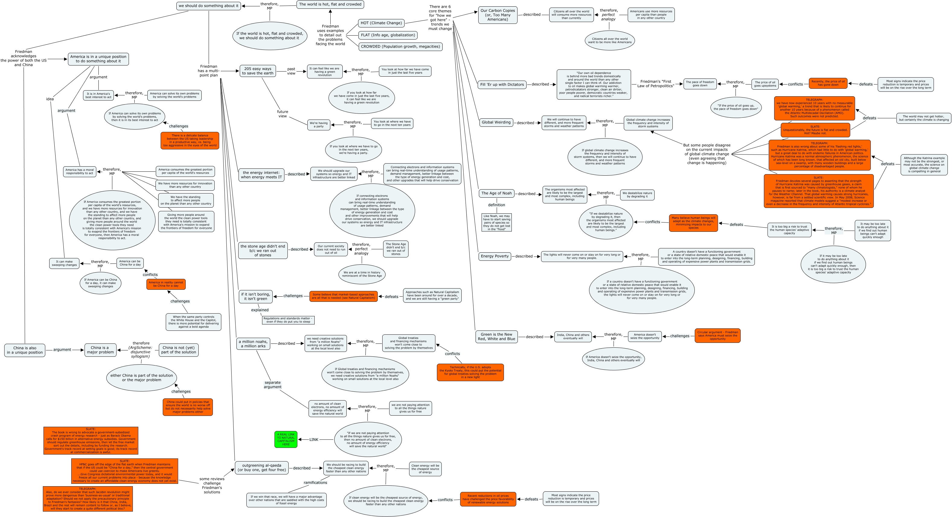 This Concept Map, created with IHMC CmapTools, has information related to: TermProject arg3HFC 120408, 205 easy ways to save the earth past view It can feel like we are having a green revolution, SLATE: HF&C goes off the edge of the flat earth when Friedman maintains that if the US could be "China for a day," then the central government could use coercion to make Americans live greenly. ...Give Congress dictatorial environmental power today, and it would freeze all our current problems into place - because the knowledge necessary to create an affordable clean-energy economy does not yet exist. some reviews challenge Friedman's solutions outgreening al-qaeda (or buy one, get four free), America can be China for a day therefore, MP It can make sweeping changes, "Our own oil dependence is behind more bad trends domestically and around the world than any other single factor I can think of. Our addiction to oil makes global warming warmer, petrodicatators stronger, clean air dirtier, poor people poorer, democratic countries weaker, and radical terrorists richer." Friedman's "First Law of Petropolitics" The pace of freedom goes down, The Age of Noah definition Like Noah, we may have to start saving pairs of species so they do not get lost in the "flood", The price of oil goes upsystems therefore, MP The pace of freedom goes down, When the same party controls the White House and the Capitol, there is more potential for delivering against a bold agenda challenges America in reality cannot be China for a day, HOT (Climate Change) There are 6 core themes for "how we got here" - trends we must change Energy Poverty, "If we are not paying attention to all the things nature gives us for free, then no amount of clean electrons, no amount of energy efficiency will save the natural world" LINK A REAL LINK TO NATURAL CAPITALISM HERE, we should do something about it Friedman has a multi- point plan 205 easy ways to save the earth, SLATE: Unquestionably, the future is flat and crowded. Hot? Maybe not. But some people disagree on the current impacts of global climate change (even agreeing that change is happening) Global climate change increases the frequency and intensity of storm systems, TELEGRAPH: Friedman is also wrong about some of his 'flashing red lights,' such as Hurricane Katrina, which had little to do with 'global warming,' but a great deal to do with endemic failures in American politics. Hurricane Katrina was a normal atmospheric phenomenon, the science of which has been long known, that affected an old city, built below sea-level on a swamp, with many wooden buildings and a large percentage of disadvantaged people. But some people disagree on the current impacts of global climate change (even agreeing that change is happening) Global climate change increases the frequency and intensity of storm systems, America is in a unique position to do something about it argument America has a moral responsibility to act, Fill 'Er up with Dictators described "Our own oil dependence is behind more bad trends domestically and around the world than any other single factor I can think of. Our addiction to oil makes global warming warmer, petrodicatators stronger, clean air dirtier, poor people poorer, democratic countries weaker, and radical terrorists richer.", America consumes the greatest portion per capita of the world's resources therefore, MP America has a moral responsibility to act, Although the Katrina example may not be the strongest, or most accurate, the science on global climate change is compelling in general defeats SLATE: Friedman devotes several pages to asserting that the strength of Hurricane Katrina was caused by greenhouse gases, a claim that is first sourced to "many climatologists," none of whom he pauses to name; later in the book, his authority is a climate analyst for the Weather Channel. That global warming causes strong hurricanes, however, is far from a settled scientific view. In May 2008, Science magazine reported that climate models suggest a "modest increase or even a decrease in the frequency and intensity of Atlantic tropical cyclones.", we are not paying attention to all the things nature gives us for free therefore, MP no amount of clean electrons, no amount of energy efficiency will save the natural world, we should do something about it Friedman has a multi- point plan the energy internet: when energy meets IT, Circular argument - Friedman says America must seize the opportunity challenges America doesn't seize the opportunity, Green is the New Red, White and Blue described India, China and others eventually will
