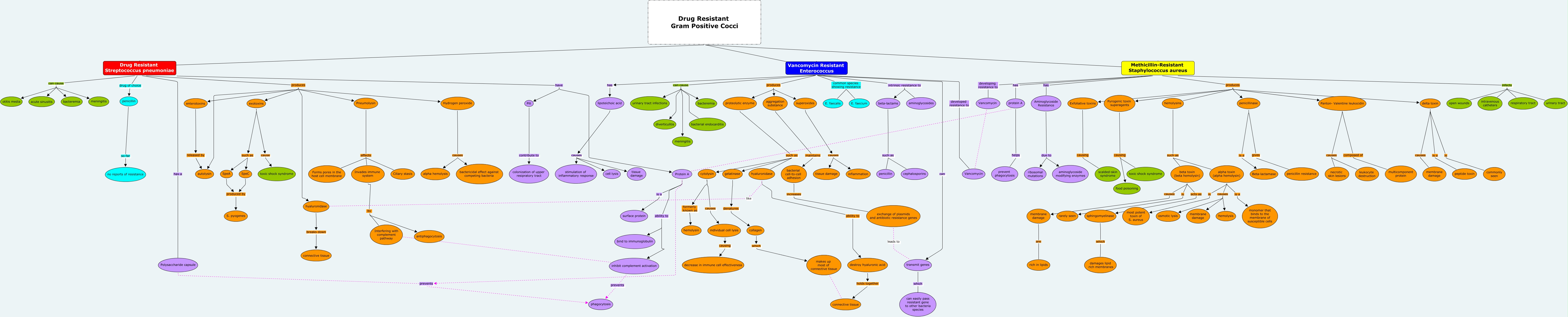 This Concept Map, created with IHMC CmapTools, has information related to: J and A Map Linear, Hydrogen peroxide causes bactericidal effect against competing bacteria, Vancomycin Resistant Enterococcus common species showing resistance E. faecium, Pneumolysin effects Ciliary stasis, delta toxin is a peptide toxin, Methicillin-Resistant Staphylococcus aureus developing resistance to Vancomycin, Methicillin-Resistant Staphylococcus aureus has Aminoglycoside Resistance, Drug Resistant Streptococcus pneumoniae has a Polysaccharide capsule, cytolysin formerly known as hemolysin, hyaluronidase ability to destroy hyaluronic acid, Aminoglycoside Resistance due to aminoglycoside modifying enzymes, hyaluronidase like hyaluronidase, beta toxin (beta hemolysin) is rarely seen, aggregation substance maintains bacterial cell-to-cell adhesion, Vancomycin Resistant Enterococcus produces aggregation substance, Vancomycin Resistant Enterococcus produces proteolytic enzyme, exotoxins cause toxic shock syndrome, Interfering with complement pathway ???? inhibit complement activation, inhibit complement activation prevents phagocytosis, cytolysin causes individual cell lysis, beta-lactams such as cephalosporins