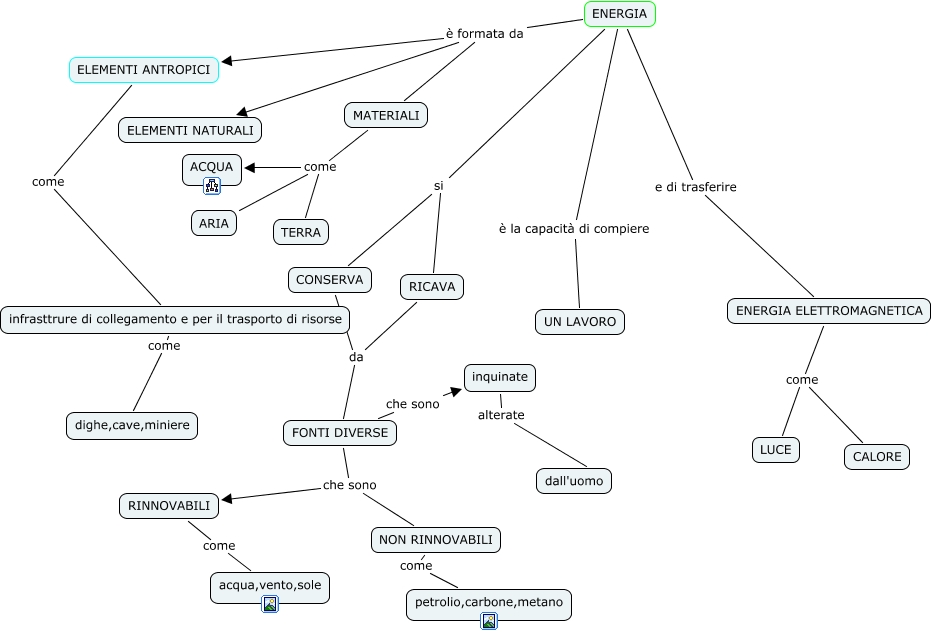 Questa Cmap, creata con IHMC CmapTools, contiene informazioni relative a: energia Gabriella, ENERGIA è formata da MATERIALI, RINNOVABILI come acqua,vento,sole, ENERGIA si CONSERVA, ENERGIA è formata da ELEMENTI ANTROPICI, infrasttrure di collegamento e per il trasporto di risorse come dighe,cave,miniere, FONTI DIVERSE che sono inquinate, RICAVA da FONTI DIVERSE, ENERGIA ELETTROMAGNETICA come LUCE, CONSERVA da FONTI DIVERSE, ENERGIA si RICAVA, NON RINNOVABILI come petrolio,carbone,metano, FONTI DIVERSE che sono NON RINNOVABILI, ENERGIA ELETTROMAGNETICA come CALORE, MATERIALI come TERRA, ENERGIA è la capacità di compiere UN LAVORO, ENERGIA è formata da ELEMENTI NATURALI, MATERIALI come ARIA, inquinate alterate dall'uomo, ENERGIA e di trasferire ENERGIA ELETTROMAGNETICA, ELEMENTI ANTROPICI come infrasttrure di collegamento e per il trasporto di risorse