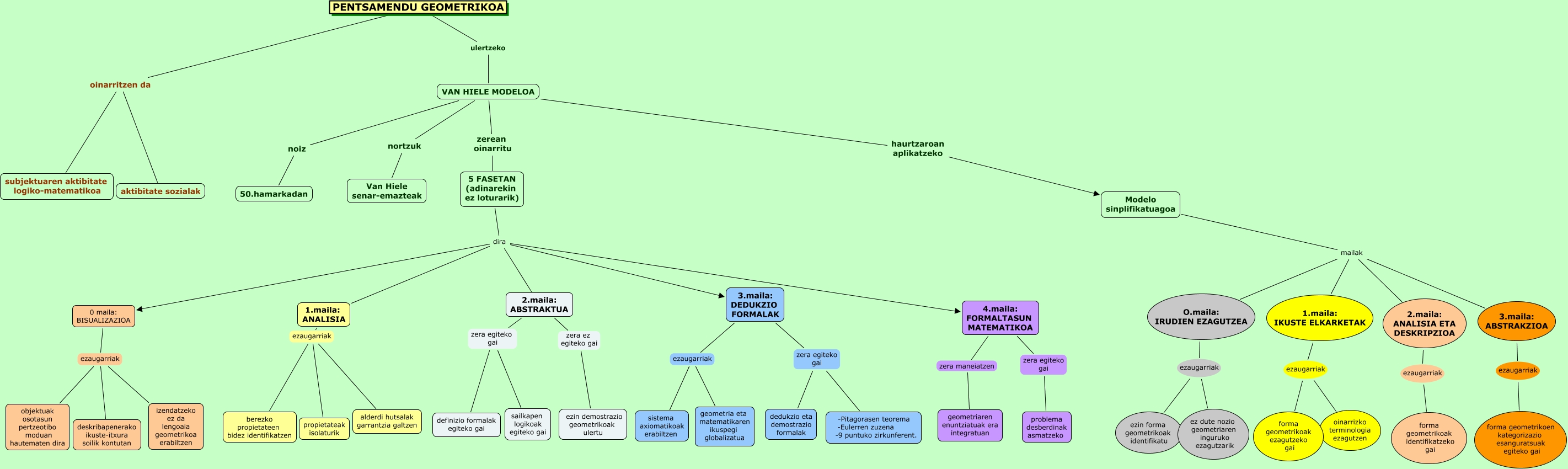 This Concept Map, created with IHMC CmapTools, has information related to: VAN HEILE, 1.maila: ANALISIA ezaugarriak alderdi hutsalak garrantzia galtzen, O.maila: IRUDIEN EZAGUTZEA ezaugarriak ez dute nozio geometriaren inguruko ezagutzarik, 5 FASETAN (adinarekin ez loturarik) dira 4.maila: FORMALTASUN MATEMATIKOA, 5 FASETAN (adinarekin ez loturarik) dira 0 maila: BISUALIZAZIOA, 3.maila: DEDUKZIO FORMALAK ezaugarriak sistema axiomatikoak erabiltzen, VAN HIELE MODELOA haurtzaroan aplikatzeko Modelo sinplifikatuagoa, 5 FASETAN (adinarekin ez loturarik) dira 2.maila: ABSTRAKTUA, O.maila: IRUDIEN EZAGUTZEA ezaugarriak ezin forma geometrikoak identifikatu, PENTSAMENDU GEOMETRIKOA ulertzeko VAN HIELE MODELOA, 4.maila: FORMALTASUN MATEMATIKOA zera maneiatzen geometriaren enuntziatuak era integratuan, 3.maila: DEDUKZIO FORMALAK zera egiteko gai -Pitagorasen teorema -Eulerren zuzena -9 puntuko zirkunferent., 0 maila: BISUALIZAZIOA ezaugarriak objektuak osotasun pertzeotibo moduan hautematen dira, 0 maila: BISUALIZAZIOA ezaugarriak izendatzeko ez da lengoaia geometrikoa erabiltzen, 2.maila: ABSTRAKTUA zera egiteko gai sailkapen logikoak egiteko gai, 2.maila: ANALISIA ETA DESKRIPZIOA ezaugarriak forma geometrikoak identifikatzeko gai, 2.maila: ABSTRAKTUA zera egiteko gai definizio formalak egiteko gai, 3.maila: ABSTRAKZIOA ezaugarriak forma geometrikoen kategorizazio esanguratsuak egiteko gai, 3.maila: DEDUKZIO FORMALAK ezaugarriak geometria eta matematikaren ikuspegi globalizatua, PENTSAMENDU GEOMETRIKOA oinarritzen da aktibitate sozialak, 5 FASETAN (adinarekin ez loturarik) dira 1.maila: ANALISIA