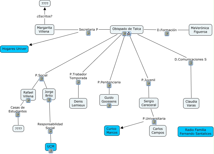Este mapa conceptual tiene información relacionada a: IC Iglesia, Sergio Cereceral P.Universitaria Curico Marcos, Rafael Villena Casas de Estudiantes ????, Obispado de Talca Secretaria P Hogares Univer, Jorge Brito Responsabilidad Social UCM, Obispado de Talca P.Social Rafael Villena, Margarita Villena ¿Escritos? ????, Obispado de Talca P.Juvenil Sergio Cereceral, Obispado de Talca P.Penitenciaria Guido Goossens, Obispado de Talca D.Comunicaciones S Claudia Varas, Obispado de Talca Secretaria P Margarita Villena