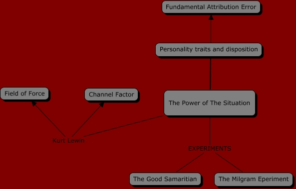 This Concept Map, created with IHMC CmapTools, has information related to: Situation, The Power of The Situation Kurt Lewin Channel Factor, The Power of The Situation EXPERIMENTS The Milgram Eperiment, The Power of The Situation ???? Personality traits and disposition, The Power of The Situation Kurt Lewin Field of Force, The Power of The Situation EXPERIMENTS The Good Samaritian, The Power of The Situation ???? Fundamental Attribution Error, The Power of The Situation ???? Fundamental Attribution Error