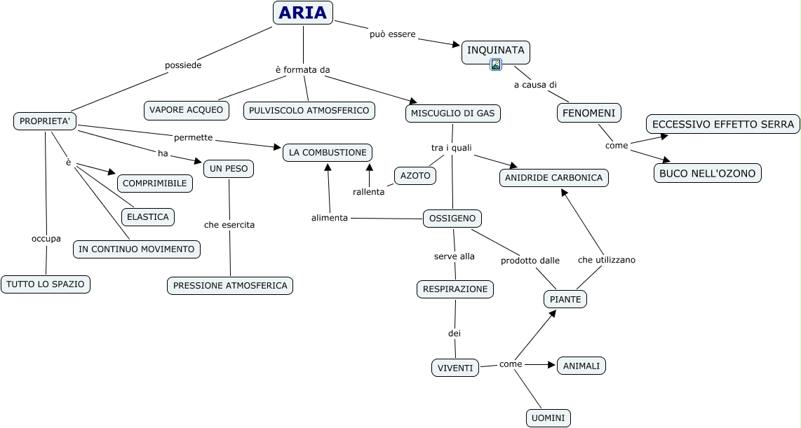 Questa Cmap, creata con IHMC CmapTools, contiene informazioni relative a: ARIA_CARMELA_SABBA, PIANTE che utilizzano ANIDRIDE CARBONICA, PROPRIETA' permette LA COMBUSTIONE, OSSIGENO serve alla RESPIRAZIONE, MISCUGLIO DI GAS tra i quali ANIDRIDE CARBONICA, OSSIGENO prodotto dalle PIANTE, PROPRIETA' è IN CONTINUO MOVIMENTO, INQUINATA a causa di FENOMENI, FENOMENI come BUCO NELL'OZONO, OSSIGENO alimenta LA COMBUSTIONE, MISCUGLIO DI GAS tra i quali OSSIGENO, VIVENTI come UOMINI, RESPIRAZIONE dei VIVENTI, PROPRIETA' è COMPRIMIBILE, FENOMENI come ECCESSIVO EFFETTO SERRA, VIVENTI come PIANTE, PROPRIETA' è ELASTICA, ARIA può essere INQUINATA, UN PESO che esercita PRESSIONE ATMOSFERICA, AZOTO rallenta LA COMBUSTIONE, VIVENTI come ANIMALI