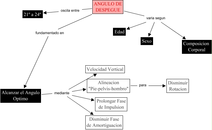 Aquest mapa conceptual conté informació relacionada amb: cmap OTROS, Alcanzar el Angulo Optimo mediante Alineacion "Pie-pelvis-hombro", Alcanzar el Angulo Optimo mediante Velocidad Vertical, Alineacion "Pie-pelvis-hombro" para Disminuir Rotacion, ANGULO DE DESPEGUE fundamentado en Alcanzar el Angulo Optimo, Alcanzar el Angulo Optimo mediante Disminuir Fase de Amortiguacion, ANGULO DE DESPEGUE varia segun Composicion Corporal, ANGULO DE DESPEGUE varia segun Sexo, Alcanzar el Angulo Optimo mediante Prolongar Fase de Impulsion, ANGULO DE DESPEGUE oscila entre 21º a 24º, ANGULO DE DESPEGUE varia segun Edad