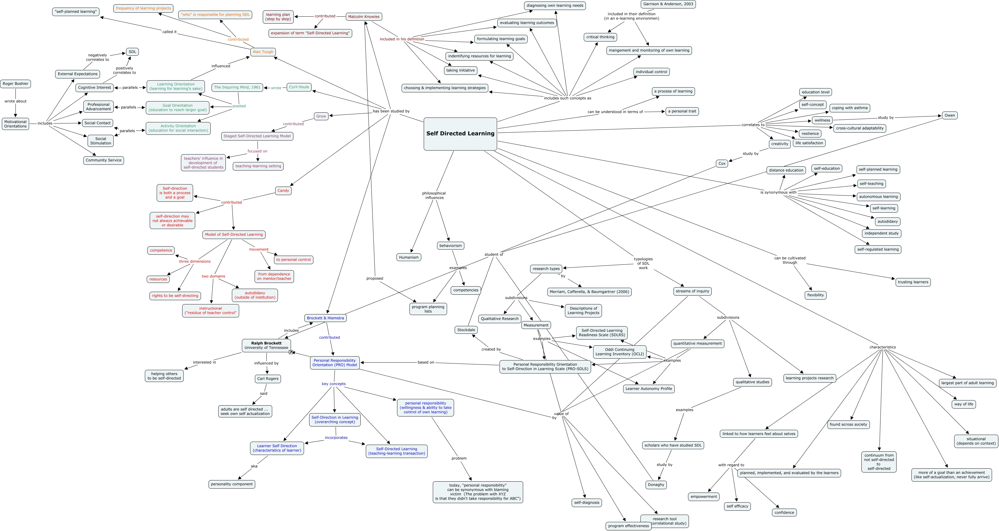 This Concept Map, created with IHMC CmapTools, has information related to: Self Directed Learning, Self Directed Learning can be cultivated through trusting learners, quantitative measurement examples Learner Autonomy Profile, Self Directed Learning includes such concepts as critical thinking, Self-Direction in Learning (overarching concept) incorporates Self-Directed Learning (teaching-learning transaction), Self Directed Learning characteristics continuum from not self-directed to self-directed, Cognitive Interest positively correlates to SDL, Self Directed Learning characteristics situational (depends on context), Malcolm Knowles contributed learning plan (step by step), research types subdivisions Descriptions of Learning Projects, Measurement examples Learner Autonomy Profile, Self Directed Learning correlates to coping with asthma, personal responsibility (willingness & ability to take control of own learning) problem today, "personal responsibility" can be synonymous with blaming victim (The problem with XYZ is that they didn't take responsibility for ABC"), Brockett & Hiemstra contributed Personal Responsibility Orientation (PRO) Model, Self Directed Learning includes such concepts as taking initiative, Personal Responsibility Orientation (PRO) Model key concepts Self-Directed Learning (teaching-learning transaction), Self Directed Learning can be understood in terms of a process of learning, Self Directed Learning characteristics linked to how learners feel about selves, Alan Tough contributed frequency of learning projects, Self Directed Learning has been studied by Candy, Donaghy student of Ralph Brockett University of Tennessee