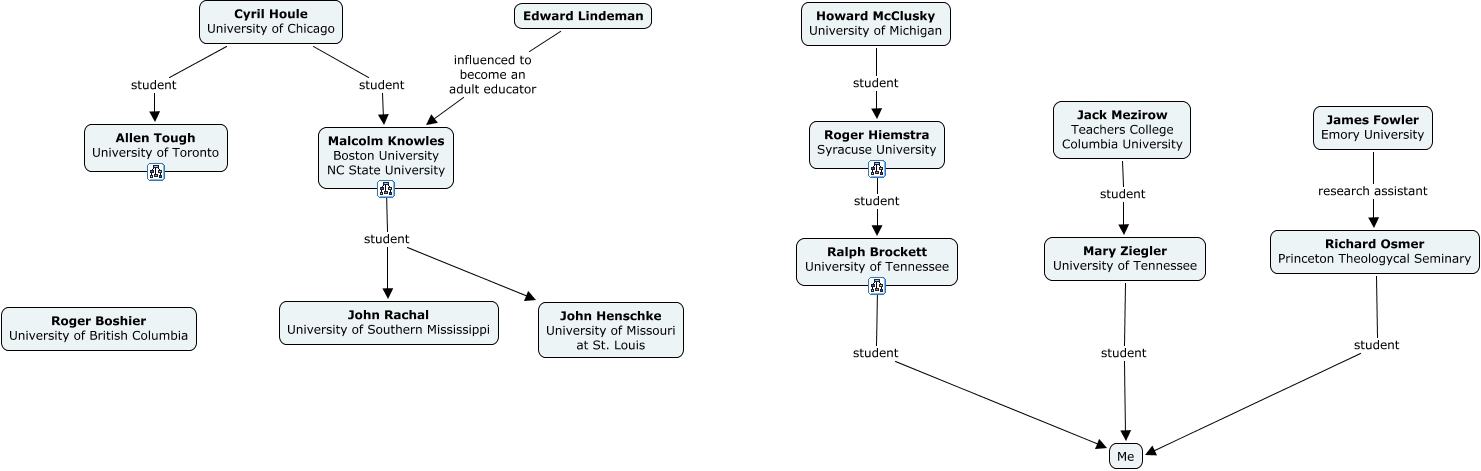 This Concept Map, created with IHMC CmapTools, has information related to: Geneology of Scholars, Roger Hiemstra Syracuse University student Ralph Brockett University of Tennessee, Howard McClusky University of Michigan student Roger Hiemstra Syracuse University, James Fowler Emory University research assistant Richard Osmer Princeton Theologycal Seminary, Edward Lindeman influenced to become an adult educator Malcolm Knowles Boston University NC State University, Ralph Brockett University of Tennessee student Me, Mary Ziegler University of Tennessee student Me, Malcolm Knowles Boston University NC State University student John Henschke University of Missouri at St. Louis, Malcolm Knowles Boston University NC State University student John Rachal University of Southern Mississippi, Jack Mezirow Teachers College Columbia University student Mary Ziegler University of Tennessee, Cyril Houle University of Chicago student Malcolm Knowles Boston University NC State University, Cyril Houle University of Chicago student Allen Tough University of Toronto, Richard Osmer Princeton Theologycal Seminary student Me