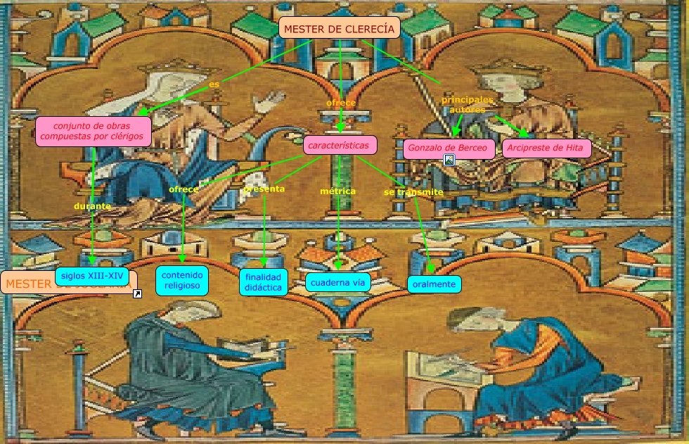 Este Cmap, tiene información relacionada con: index 1, siglos XIII-XIV ???? MESTER DE JUGLARÍA, características métrica cuaderna vía, MESTER DE CLERECÍA ofrece características, características ofrece contenido religioso, MESTER DE CLERECÍA principales autores Arcipreste de Hita, MESTER DE CLERECÍA principales autores Gonzalo de Berceo, MESTER DE CLERECÍA es conjunto de obras compuestas por clérigos, características presenta finalidad didáctica, características se transmite oralmente, conjunto de obras compuestas por clérigos durante siglos XIII-XIV