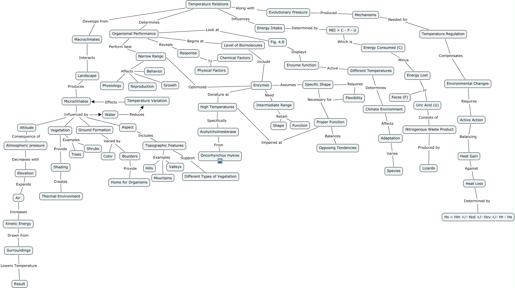 This Concept Map, created with IHMC CmapTools, has information related to: Judy & Rosen Final, Temperature Relations Along with Evolutionary Pressure, Temperature Variation Effects Microclimates, Altitude Consequence of Atmospheric pressure, Environmental Changes Requires Active Action, Intermediate Range Retain Function, Topographic Features Examples Mountains, Organismal Performance Look at Fig. 4.8, Topographic Features Support Different Types of Vegetation, Microclimates Influenced by Ground Formation, Enzymes Need Intermediate Range, Elevation Expands Air, Ground Formation Varied by Color, Response To Physical Factors, Proper Function Balances Opposing Tendencies, Temperature Relations Determines Organismal Performance, Heat Gain Against Heat Loss, Narrow Range Affects Growth, Level of Biomolecules Include Enzymes, Narrow Range Affects Reproduction, Aspect Includes Topographic Features