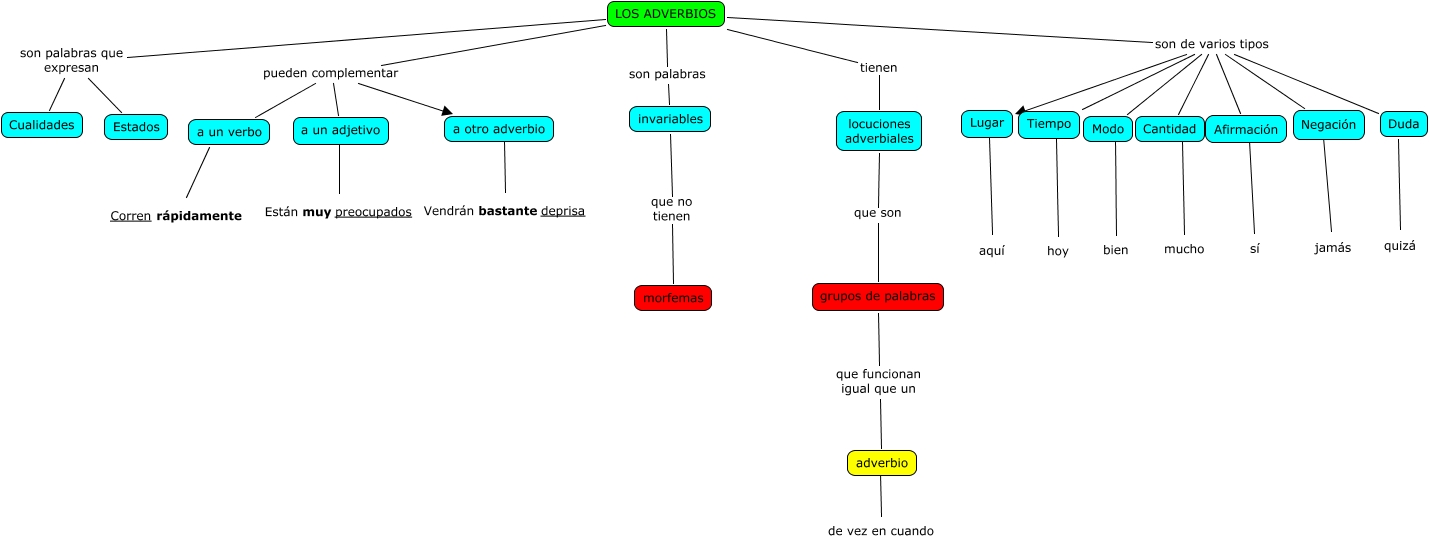 Este mapa conceptual tiene información relacionada a: Los adverbios (Saúl), Tiempo ???? hoy, LOS ADVERBIOS tienen locuciones adverbiales, LOS ADVERBIOS son de varios tipos Tiempo, LOS ADVERBIOS son palabras que expresan Cualidades, LOS ADVERBIOS pueden complementar a un adjetivo, a otro adverbio ???? Vendrán bastante deprisa, invariables que no tienen morfemas, Modo ???? bien, LOS ADVERBIOS son de varios tipos Negación, LOS ADVERBIOS son palabras que expresan Estados, a un adjetivo ???? Están muy preocupados, LOS ADVERBIOS son de varios tipos Duda, Negación ???? jamás, LOS ADVERBIOS son palabras invariables, LOS ADVERBIOS son de varios tipos Modo, a un verbo ???? Corren rápidamente, Cantidad ???? mucho, Lugar ???? aquí, LOS ADVERBIOS son de varios tipos Lugar, Duda ???? quizá