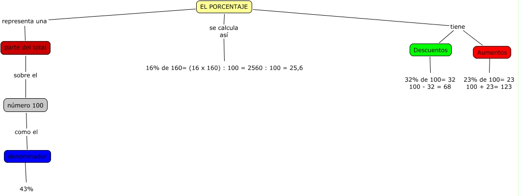 Este Cmap, tiene información relacionada con: El porcentaje (Saúl), denominador ???? 43%, EL PORCENTAJE tiene Descuentos, EL PORCENTAJE representa una parte del total, parte del total sobre el número 100, número 100 como el denominador, EL PORCENTAJE se calcula así 16% de 160= (16 x 160) : 100 = 2560 : 100 = 25,6, Descuentos ???? 32% de 100= 32 100 - 32 = 68, Aumentos ???? 23% de 100= 23 100 + 23= 123, EL PORCENTAJE tiene Aumentos
