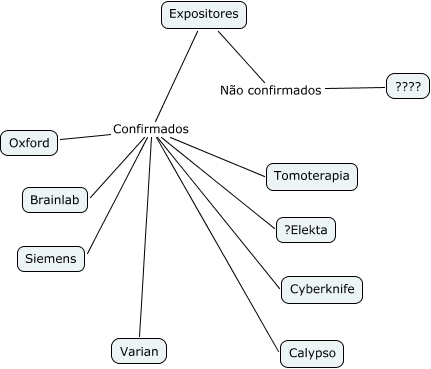 Esse mapa conceitual, produzido no IHMC CmapTools, tem a informação relacionada a: Congresso Brasileiro de Física Médica Expositores, Expositores Confirmados Varian, Expositores Não confirmados ????, Expositores Confirmados Tomoterapia, Expositores Confirmados Calypso, Expositores Confirmados Cyberknife, Expositores Confirmados ?Elekta, Expositores Confirmados Oxford, Expositores Confirmados Siemens, Expositores Confirmados Brainlab