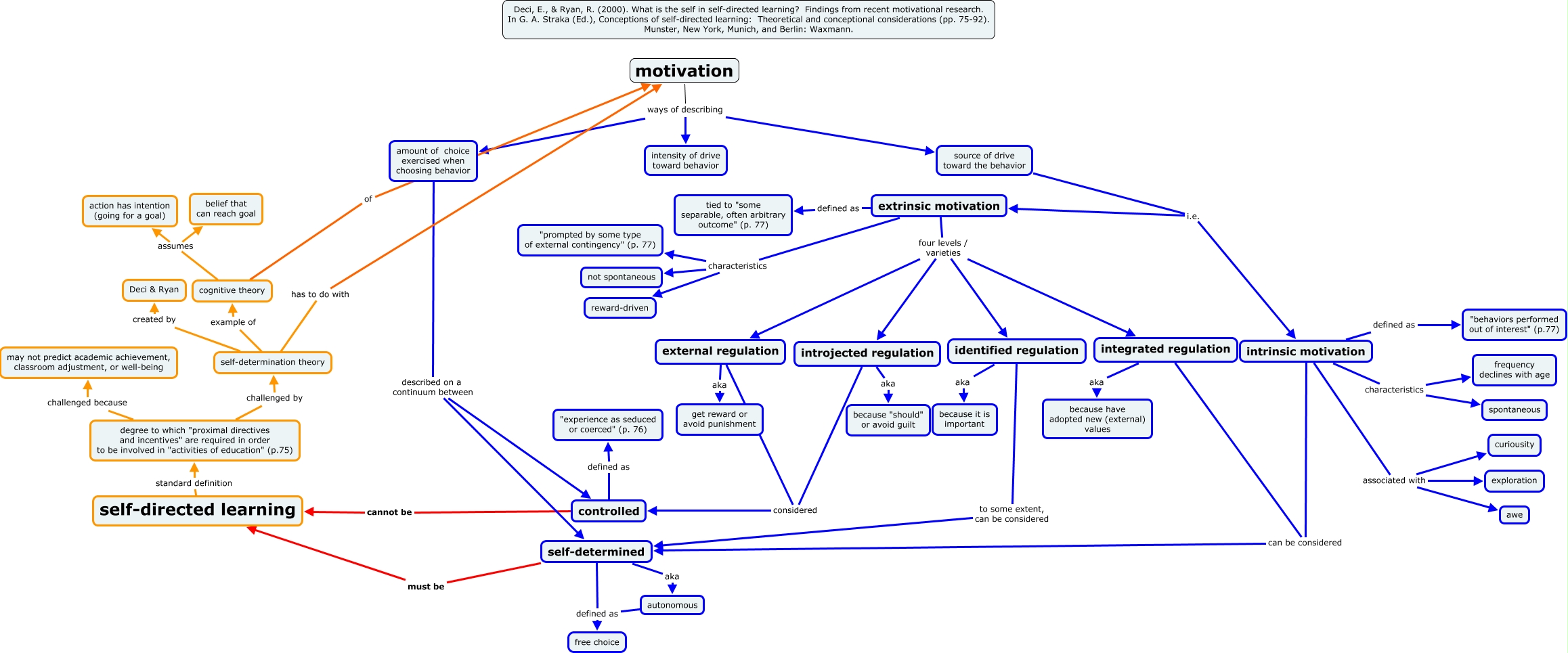 This Concept Map, created with IHMC CmapTools, has information related to: Deci & Ryan 2000, degree to which "proximal directives and incentives" are required in order to be involved in "activities of education" (p.75) challenged by self-determination theory, external regulation aka get reward or avoid punishment, extrinsic motivation four levels / varieties introjected regulation, degree to which "proximal directives and incentives" are required in order to be involved in "activities of education" (p.75) challenged because may not predict academic achievement, classroom adjustment, or well-being, cognitive theory assumes action has intention (going for a goal), self-determined defined as free choice, external regulation considered controlled, extrinsic motivation characteristics not spontaneous, amount of choice exercised when choosing behavior described on a continuum between self-determined, intrinsic motivation characteristics spontaneous, introjected regulation considered controlled, identified regulation aka because it is important, self-directed learning standard definition degree to which "proximal directives and incentives" are required in order to be involved in "activities of education" (p.75), extrinsic motivation characteristics reward-driven, identified regulation to some extent, can be considered self-determined, self-determination theory example of cognitive theory, motivation ways of describing amount of choice exercised when choosing behavior, self-determined must be self-directed learning, source of drive toward the behavior i.e. intrinsic motivation, cognitive theory assumes belief that can reach goal