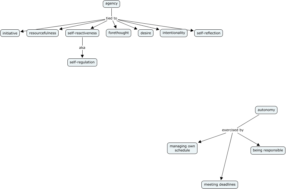 This Concept Map, created with IHMC CmapTools, has information related to: Concepts Related to SDL, agency tied to forethought, autonomy exercised by being responsible, agency tied to self-reflection, autonomy exercised by managing own schedule, agency tied to intentionality, agency tied to self-reactiveness, self-reactiveness aka self-regulation, agency tied to desire, autonomy exercised by meeting deadlines, agency tied to resourcefulness, agency tied to initiative