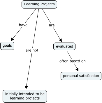 This Concept Map, created with IHMC CmapTools, has information related to: Notes on Learning Projects, Learning Projects have goals, Learning Projects are not initially intended to be learning projects, evaluated often based on personal satisfaction, Learning Projects are evaluated