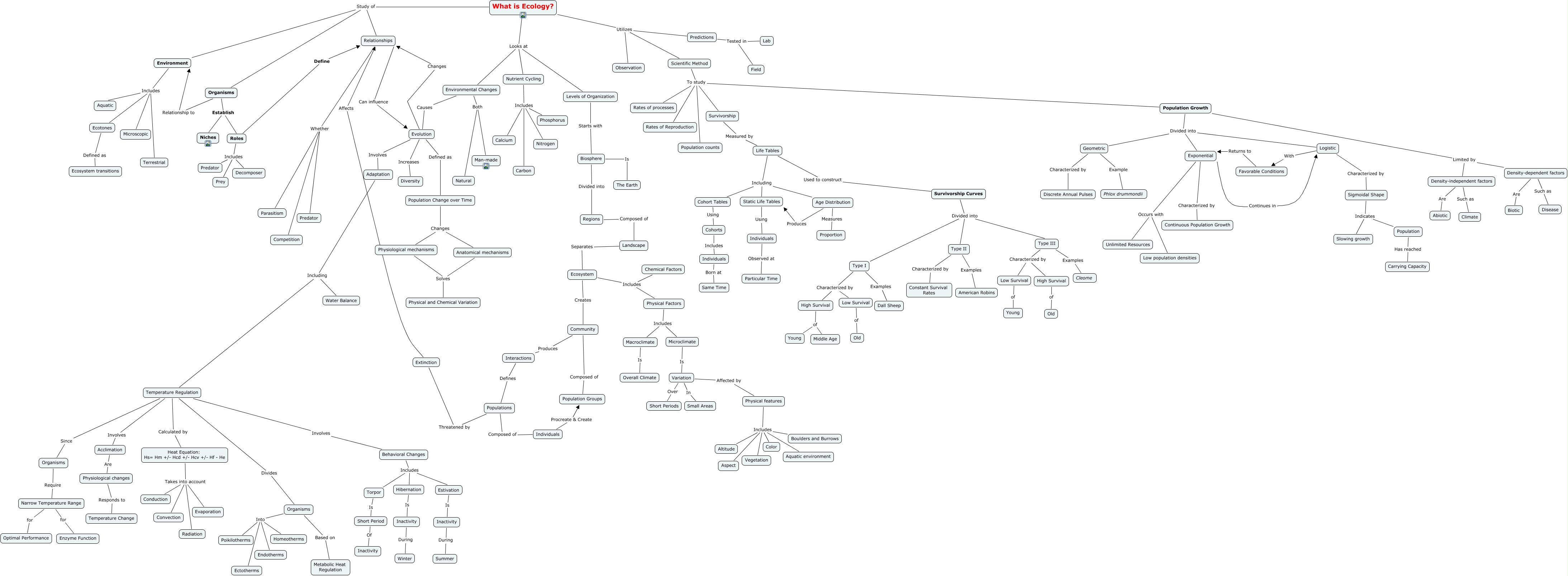 This Concept Map, created with IHMC CmapTools, has information related to: Judy & Andrew mid final, Relationships Can influence Evolution, Density-independent factors Such as Climate, Cohort Tables Using Cohorts, Type I Characterized by Low Survival, Individuals Born at Same Time, What is Ecology? Looks at Nutrient Cycling, Exponential Characterized by Continuous Population Growth, Adaptation Including Water Balance, What is Ecology? Looks at Levels of Organization, Ecosystem Creates Community, Extinction Affects Relationships, Regions Composed of Landscape, Population Growth Divided into Logistic, Variation In Small Areas, Community Composed of Population Groups, High Survival of Middle Age, Organisms Establish Roles, Low Survival of Old, Age Distribution Produces Static Life Tables, Heat Equation: Hs= Hm +/- Hcd +/- Hcv +/- Hf - He Takes into account Convection