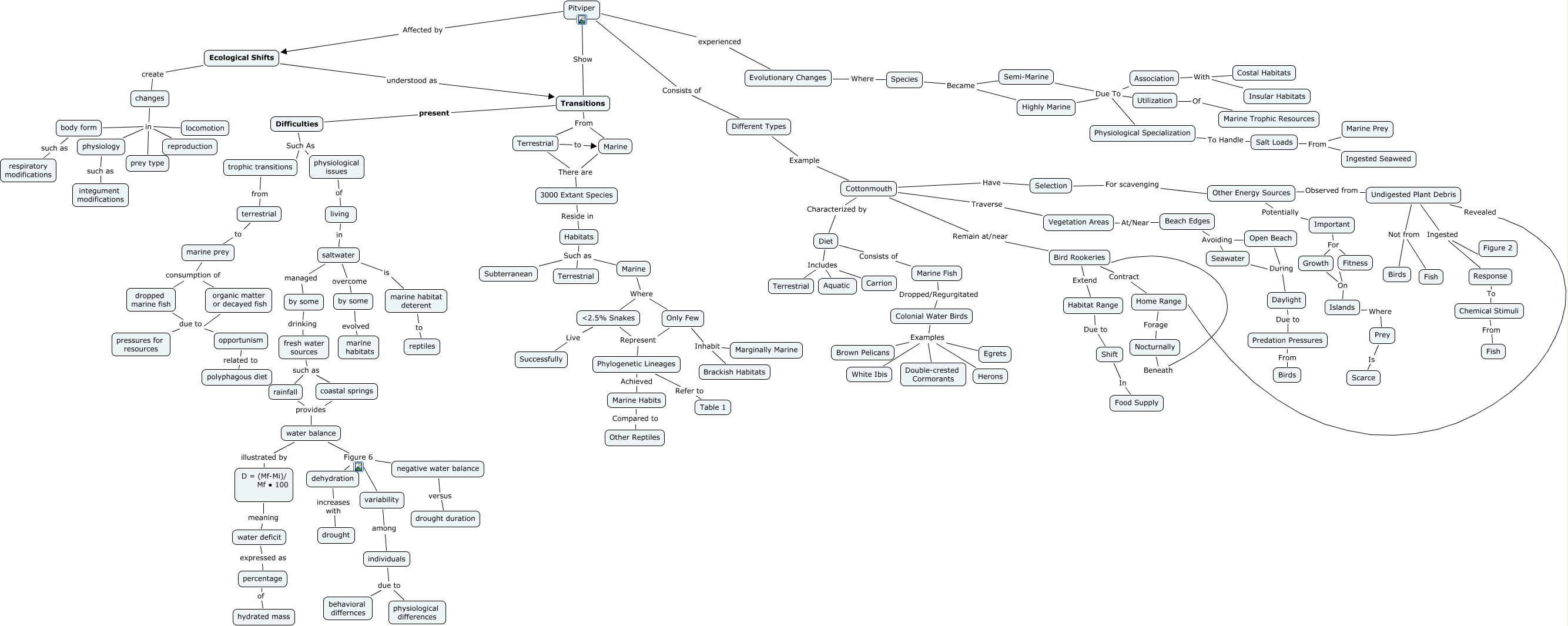 This Concept Map, created with IHMC CmapTools, has information related to: Rosen & Lacie Final, Utilization Of Marine Trophic Resources, Difficulties Such As physiological issues, opportunism related to polyphagous diet, Ecological Shifts create changes, Highly Marine Due To Association, individuals due to physiological differences, individuals due to behavioral differnces, Difficulties Such As trophic transitions, Bird Rookeries Contract Home Range, Seawater During Daylight, ɚ.5% Snakes Represent Phylogenetic Lineages, Marine Habits Compared to Other Reptiles, Semi-Marine Due To Utilization, Semi-Marine Due To Association, water balance Figure 6 dehydration, water balance Figure 6 negative water balance, changes in locomotion, physiology such as integument modifications, Vegetation Areas At/Near Beach Edges, Nocturnally Beneath Bird Rookeries