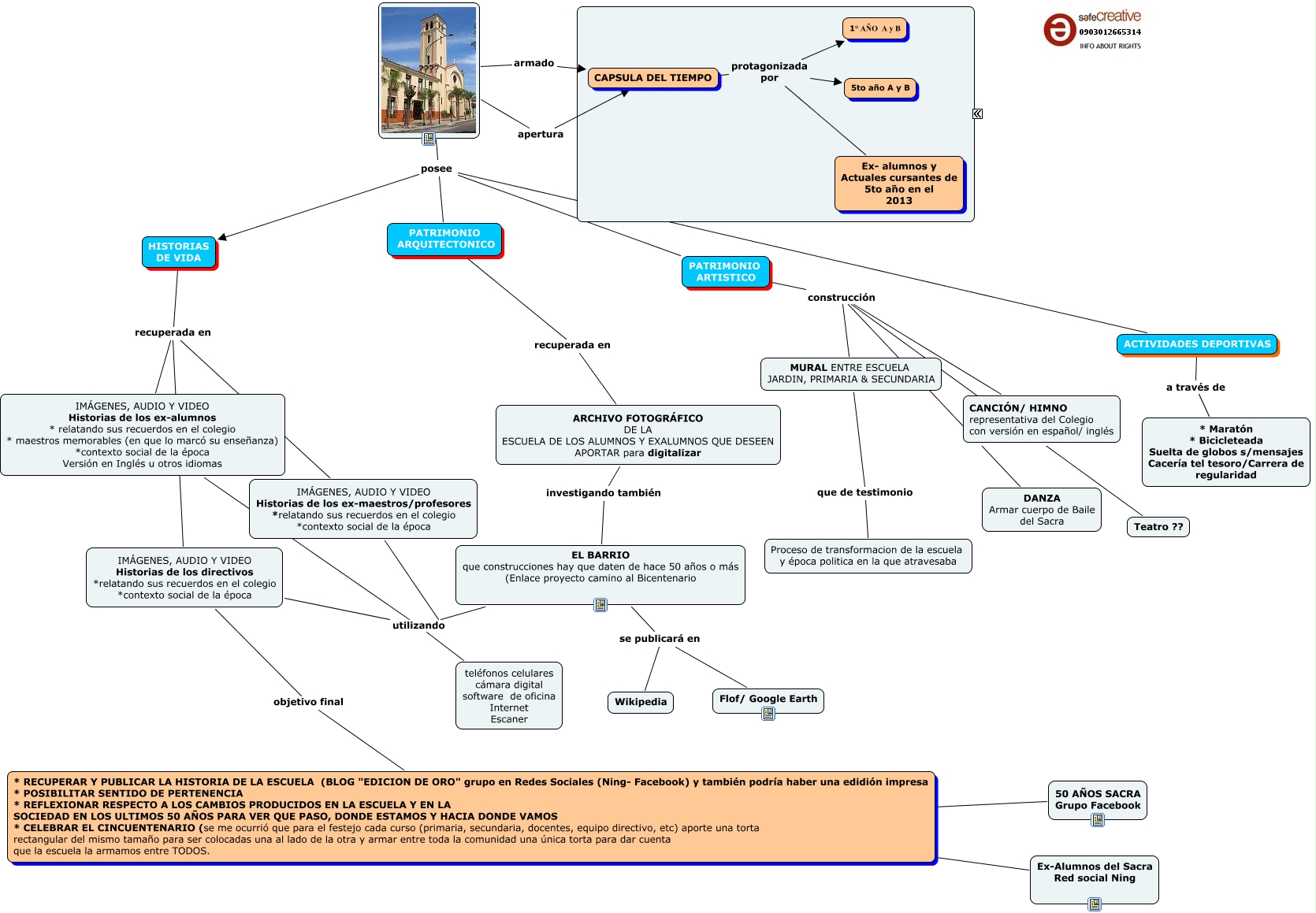 Este Cmap, tiene información relacionada con: proyecto 50 años, PATRIMONIO ARTISTICO construcción DANZA Armar cuerpo de Baile del Sacra, IMÁGENES, AUDIO Y VIDEO Historias de los directivos *relatando sus recuerdos en el colegio *contexto social de la época utilizando teléfonos celulares cámara digital software de oficina Internet Escaner, ???? armado CAPSULA DEL TIEMPO, * RECUPERAR Y PUBLICAR LA HISTORIA DE LA ESCUELA (BLOG "EDICION DE ORO" grupo en Redes Sociales (Ning- Facebook) y también podría haber una edidión impresa * POSIBILITAR SENTIDO DE PERTENENCIA * REFLEXIONAR RESPECTO A LOS CAMBIOS PRODUCIDOS EN LA ESCUELA Y EN LA SOCIEDAD EN LOS ULTIMOS 50 AÑOS PARA VER QUE PASO, DONDE ESTAMOS Y HACIA DONDE VAMOS * CELEBRAR EL CINCUENTENARIO (se me ocurrió que para el festejo cada curso (primaria, secundaria, docentes, equipo directivo, etc) aporte una torta rectangular del mismo tamaño para ser colocadas una al lado de la otra y armar entre toda la comunidad una única torta para dar cuenta que la escuela la armamos entre TODOS. ???? Ex-Alumnos del Sacra Red social Ning, ???? posee ACTIVIDADES DEPORTIVAS, ???? posee PATRIMONIO ARQUITECTONICO, IMÁGENES, AUDIO Y VIDEO Historias de los ex-maestros/profesores *relatando sus recuerdos en el colegio *contexto social de la época utilizando teléfonos celulares cámara digital software de oficina Internet Escaner, EL BARRIO que construcciones hay que daten de hace 50 años o más (Enlace proyecto camino al Bicentenario utilizando teléfonos celulares cámara digital software de oficina Internet Escaner, ACTIVIDADES DEPORTIVAS a través de * Maratón * Bicicleteada Suelta de globos s/mensajes Cacería tel tesoro/Carrera de regularidad, CAPSULA DEL TIEMPO protagonizada por 1° AÑO A y B, EL BARRIO que construcciones hay que daten de hace 50 años o más (Enlace proyecto camino al Bicentenario se publicará en Flof/ Google Earth, ARCHIVO FOTOGRÁFICO DE LA ESCUELA DE LOS ALUMNOS Y EXALUMNOS QUE DESEEN APORTAR para digitalizar investigando también EL BARRIO que construcciones hay que daten de hace 50 años o más (Enlace proyecto camino al Bicentenario, PATRIMONIO ARQUITECTONICO recuperada en ARCHIVO FOTOGRÁFICO DE LA ESCUELA DE LOS ALUMNOS Y EXALUMNOS QUE DESEEN APORTAR para digitalizar, EL BARRIO que construcciones hay que daten de hace 50 años o más (Enlace proyecto camino al Bicentenario se publicará en Wikipedia, ???? posee HISTORIAS DE VIDA, ???? apertura CAPSULA DEL TIEMPO, * RECUPERAR Y PUBLICAR LA HISTORIA DE LA ESCUELA (BLOG "EDICION DE ORO" grupo en Redes Sociales (Ning- Facebook) y también podría haber una edidión impresa * POSIBILITAR SENTIDO DE PERTENENCIA * REFLEXIONAR RESPECTO A LOS CAMBIOS PRODUCIDOS EN LA ESCUELA Y EN LA SOCIEDAD EN LOS ULTIMOS 50 AÑOS PARA VER QUE PASO, DONDE ESTAMOS Y HACIA DONDE VAMOS * CELEBRAR EL CINCUENTENARIO (se me ocurrió que para el festejo cada curso (primaria, secundaria, docentes, equipo directivo, etc) aporte una torta rectangular del mismo tamaño para ser colocadas una al lado de la otra y armar entre toda la comunidad una única torta para dar cuenta que la escuela la armamos entre TODOS. ???? 50 AÑOS SACRA Grupo Facebook, CAPSULA DEL TIEMPO protagonizada por 5to año A y B, ???? posee PATRIMONIO ARTISTICO, PATRIMONIO ARTISTICO construcción CANCIÓN/ HIMNO representativa del Colegio con versión en español/ inglés