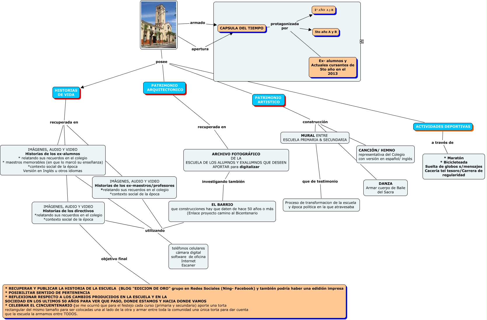 Este Cmap, tiene información relacionada con: proyectosacra, IMÁGENES, AUDIO Y VIDEO Historias de los directivos *relatando sus recuerdos en el colegio *contexto social de la época utilizando teléfonos celulares cámara digital software de oficina Internet Escaner, PATRIMONIO ARTISTICO construcción DANZA Armar cuerpo de Baile del Sacra, ???? armado CAPSULA DEL TIEMPO, ???? posee ACTIVIDADES DEPORTIVAS, EL BARRIO que construcciones hay que daten de hace 50 años o más (Enlace proyecto camino al Bicentenario utilizando teléfonos celulares cámara digital software de oficina Internet Escaner, IMÁGENES, AUDIO Y VIDEO Historias de los ex-maestros/profesores *relatando sus recuerdos en el colegio *contexto social de la época utilizando teléfonos celulares cámara digital software de oficina Internet Escaner, ???? posee PATRIMONIO ARQUITECTONICO, CAPSULA DEL TIEMPO protagonizada por 1° AÑO A y B, ACTIVIDADES DEPORTIVAS a través de * Maratón * Bicicleteada Suelta de globos s/mensajes Cacería tel tesoro/Carrera de regularidad, PATRIMONIO ARQUITECTONICO recuperada en ARCHIVO FOTOGRÁFICO DE LA ESCUELA DE LOS ALUMNOS Y EXALUMNOS QUE DESEEN APORTAR para digitalizar, ARCHIVO FOTOGRÁFICO DE LA ESCUELA DE LOS ALUMNOS Y EXALUMNOS QUE DESEEN APORTAR para digitalizar investigando también EL BARRIO que construcciones hay que daten de hace 50 años o más (Enlace proyecto camino al Bicentenario, ???? apertura CAPSULA DEL TIEMPO, ???? posee HISTORIAS DE VIDA, ???? posee PATRIMONIO ARTISTICO, CAPSULA DEL TIEMPO protagonizada por 5to año A y B, PATRIMONIO ARTISTICO construcción CANCIÓN/ HIMNO representativa del Colegio con versión en español/ inglés, HISTORIAS DE VIDA recuperada en IMÁGENES, AUDIO Y VIDEO Historias de los directivos *relatando sus recuerdos en el colegio *contexto social de la época, IMÁGENES, AUDIO Y VIDEO Historias de los ex-alumnos * relatando sus recuerdos en el colegio * maestros memorables (en que lo marcó su enseñanza) *contexto social de la época Versión en Inglés u otros idiomas utilizando teléfonos celulares cámara digital software de oficina Internet Escaner, CAPSULA DEL TIEMPO protagonizada por Ex- alumnos y Actuales cursantes de 5to año en el 2013, IMÁGENES, AUDIO Y VIDEO Historias de los directivos *relatando sus recuerdos en el colegio *contexto social de la época objetivo final * RECUPERAR Y PUBLICAR LA HISTORIA DE LA ESCUELA (BLOG "EDICION DE ORO" grupo en Redes Sociales (Ning- Facebook) y también podría haber una edidión impresa * POSIBILITAR SENTIDO DE PERTENENCIA * REFLEXIONAR RESPECTO A LOS CAMBIOS PRODUCIDOS EN LA ESCUELA Y EN LA SOCIEDAD EN LOS ULTIMOS 50 AÑOS PARA VER QUE PASO, DONDE ESTAMOS Y HACIA DONDE VAMOS * CELEBRAR EL CINCUENTENARIO (se me ocurrió que para el festejo cada curso (primaria y secundaria) aporte una torta rectangular del mismo tamaño para ser colocadas una al lado de la otra y armar entre toda la comunidad una única torta para dar cuenta que la escuela la armamos entre TODOS.