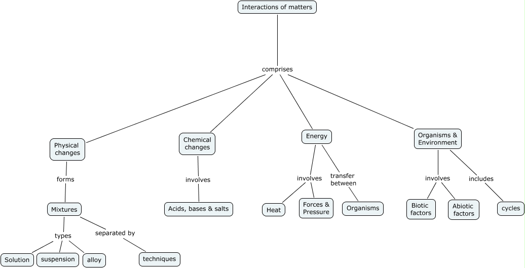 This Concept Map, created with IHMC CmapTools, has information related to: Interactions of Matters, Chemical changes involves Acids, bases & salts, Organisms & Environment includes cycles, Mixtures types alloy, Physical changes forms Mixtures, Interactions of matters comprises Physical changes, Energy involves Forces & Pressure, Mixtures separated by techniques, Organisms & Environment involves Biotic factors, Interactions of matters comprises Energy, Interactions of matters comprises Chemical changes, Mixtures types suspension, Interactions of matters comprises Organisms & Environment, Energy involves Heat, Organisms & Environment involves Abiotic factors, Energy transfer between Organisms, Mixtures types Solution