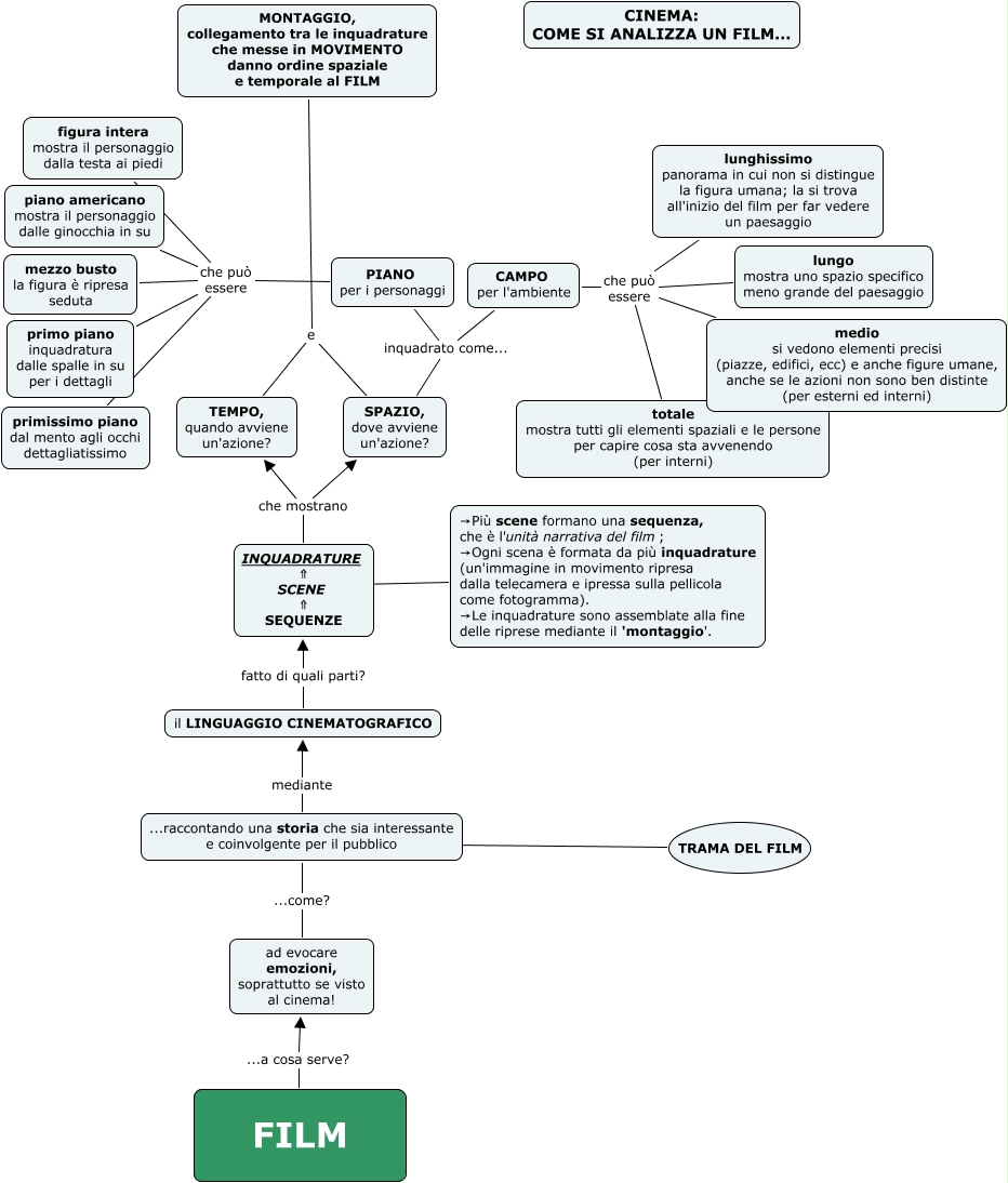 Este mapa conceptual tiene información relacionada a: Senza titolo 2, SPAZIO, dove avviene un'azione? inquadrato come... CAMPO per l'ambiente, PIANO per i personaggi che può essere piano americano mostra il personaggio dalle ginocchia in su, PIANO per i personaggi che può essere mezzo busto la figura è ripresa seduta, CAMPO per l'ambiente che può essere lungo mostra uno spazio specifico meno grande del paesaggio, ...raccontando una storia che sia interessante e coinvolgente per il pubblico mediante il LINGUAGGIO CINEMATOGRAFICO, CAMPO per l'ambiente che può essere lunghissimo panorama in cui non si distingue la figura umana; la si trova all'inizio del film per far vedere un paesaggio, INQUADRATURE ⇑ SCENE ⇑ SEQUENZE ???? →Più scene formano una sequenza, che è l'unità narrativa del film; →Ogni scena è formata da più inquadrature (un'immagine in movimento ripresa dalla telecamera e ipressa sulla pellicola come fotogramma). →Le inquadrature sono assemblate alla fine delle riprese mediante il 'montaggio'., TEMPO, quando avviene un'azione? e MONTAGGIO, collegamento tra le inquadrature che messe in MOVIMENTO danno ordine spaziale e temporale al FILM, PIANO per i personaggi che può essere primissimo piano dal mento agli occhi dettagliatissimo, PIANO per i personaggi che può essere figura intera mostra il personaggio dalla testa ai piedi, FILM ...a cosa serve? ad evocare emozioni, soprattutto se visto al cinema!, il LINGUAGGIO CINEMATOGRAFICO fatto di quali parti? INQUADRATURE ⇑ SCENE ⇑ SEQUENZE, PIANO per i personaggi che può essere primo piano inquadratura dalle spalle in su per i dettagli, ad evocare emozioni, soprattutto se visto al cinema! ...come? ...raccontando una storia che sia interessante e coinvolgente per il pubblico, SPAZIO, dove avviene un'azione? inquadrato come... PIANO per i personaggi, INQUADRATURE ⇑ SCENE ⇑ SEQUENZE che mostrano TEMPO, quando avviene un'azione?, CAMPO per l'ambiente che può essere medio si vedono elementi precisi (piazze, edifici, ecc) e anche figure umane, anche se le azioni non sono ben distinte (per esterni ed interni), INQUADRATURE ⇑ SCENE ⇑ SEQUENZE che mostrano SPAZIO, dove avviene un'azione?, ...raccontando una storia che sia interessante e coinvolgente per il pubblico ???? TRAMA DEL FILM, CAMPO per l'ambiente che può essere totale mostra tutti gli elementi spaziali e le persone per capire cosa sta avvenendo (per interni)