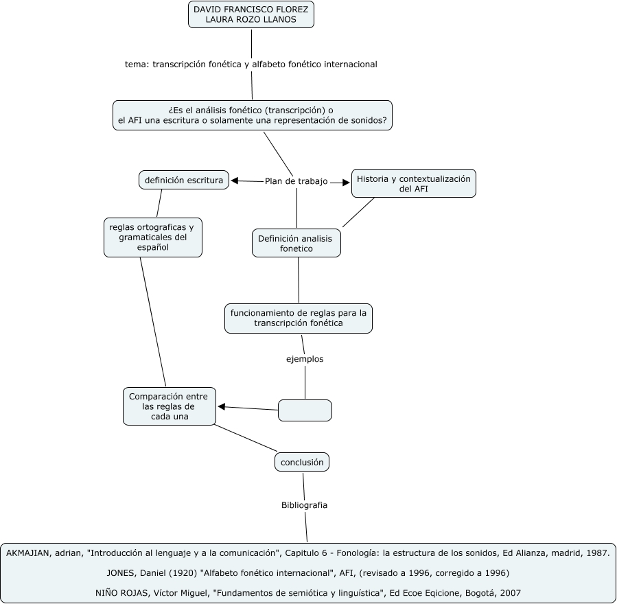 Este Cmap, tiene información relacionada con: AFI, Definición analisis fonetico ???? funcionamiento de reglas para la transcripción fonética, Comparación entre las reglas de cada una ???? conclusión, conclusión Bibliografia AKMAJIAN, adrian, "Introducción al lenguaje y a la comunicación", Capitulo 6 - Fonología: la estructura de los sonidos, Ed Alianza, madrid, 1987. JONES, Daniel (1920) "Alfabeto fonético internacional", AFI, (revisado a 1996, corregido a 1996) NIÑO ROJAS, Víctor Miguel, "Fundamentos de semiótica y linguística", Ed Ecoe Eqicione, Bogotá, 2007, ¿Es el análisis fonético (transcripción) o el AFI una escritura o solamente una representación de sonidos? Plan de trabajo Historia y contextualización del AFI, Historia y contextualización del AFI ???? Definición analisis fonetico, funcionamiento de reglas para la transcripción fonética ejemplos, ¿Es el análisis fonético (transcripción) o el AFI una escritura o solamente una representación de sonidos? Plan de trabajo Definición analisis fonetico, ???? Comparación entre las reglas de cada una, definición escritura ???? reglas ortograficas y gramaticales del español, ¿Es el análisis fonético (transcripción) o el AFI una escritura o solamente una representación de sonidos? Plan de trabajo definición escritura, reglas ortograficas y gramaticales del español ???? Comparación entre las reglas de cada una, DAVID FRANCISCO FLOREZ LAURA ROZO LLANOS tema: transcripción fonética y alfabeto fonético internacional ¿Es el análisis fonético (transcripción) o el AFI una escritura o solamente una representación de sonidos?