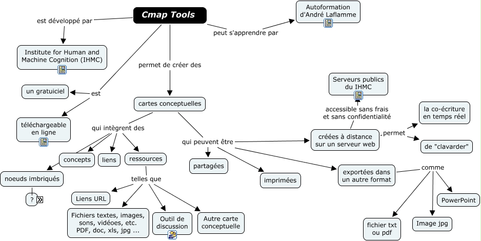 Cette carte conceptuelle, cree avec IHMC CmapTools, contient des informations liees a : Formation Cmap, cartes conceptuelles qui intègrent des noeuds imbriqués, cartes conceptuelles qui intègrent des ressources, cartes conceptuelles qui peuvent être imprimées, Cmap Tools est téléchargeable en ligne, cartes conceptuelles qui peuvent être partagées, Cmap Tools est développé par Institute for Human and Machine Cognition (IHMC), cartes conceptuelles qui peuvent être créées à distance sur un serveur web, cartes conceptuelles qui intègrent des concepts, ressources telles que Outil de discussion, créées à distance sur un serveur web permet de "clavarder", ressources telles que Liens URL, Cmap Tools peut s'apprendre par Autoformation d'André Laflamme, exportées dans un autre format comme fichier txt ou pdf, cartes conceptuelles qui peuvent être exportées dans un autre format, ressources telles que Fichiers textes, images, sons, vidéoes, etc. PDF, doc, xls, jpg ..., ressources telles que Autre carte conceptuelle, Cmap Tools permet de créer des cartes conceptuelles, noeuds imbriqués associent concept 3, noeuds imbriqués associent concepts 2, exportées dans un autre format comme PowerPoint