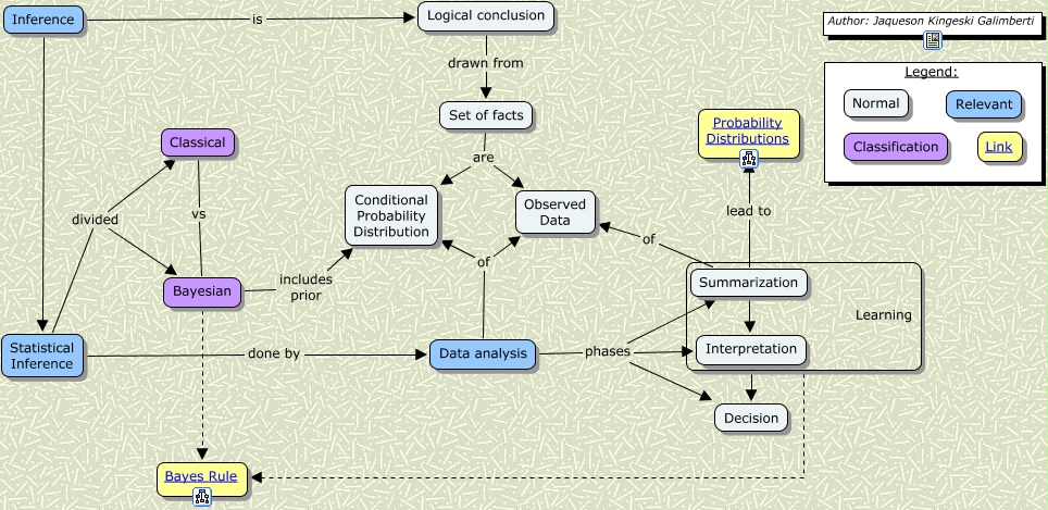 Esse mapa conceitual, produzido no IHMC CmapTools, tem a informação relacionada a: Introduction to Bayesian Inference, Data analysis phases Decision, Bayesian includes prior Conditional Probability Distribution, Inference is Logical conclusion, Data analysis phases Interpretation, Data analysis phases Summarization, Logical conclusion drawn from Set of facts, Learning Bayes Rule, Summarization lead to Probability Distributions, Bayesian Bayes Rule, Interpretation Decision, Summarization of Observed Data, Statistical Inference divided Classical, Statistical Inference done by Data analysis, Statistical Inference divided Bayesian, Inference Statistical Inference, Data analysis of Conditional Probability Distribution, Classical vs Bayesian, Data analysis of Observed Data, Summarization Interpretation