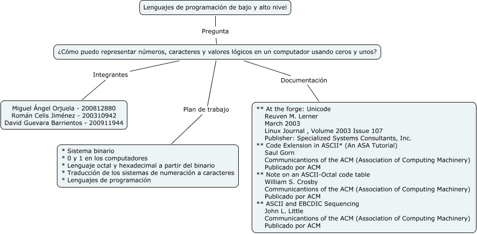 Este Cmap, tiene información relacionada con: Anteproyecto, ¿Cómo puedo representar números, caracteres y valores lógicos en un computador usando ceros y unos? Integrantes Miguel Ángel Orjuela - 200812880 Román Celis Jiménez - 200310942 David Guevara Barrientos - 200911944, Lenguajes de programación de bajo y alto nivel Pregunta ¿Cómo puedo representar números, caracteres y valores lógicos en un computador usando ceros y unos?, ¿Cómo puedo representar números, caracteres y valores lógicos en un computador usando ceros y unos? Documentación ** At the forge: Unicode Reuven M. Lerner March 2003 Linux Journal , Volume 2003 Issue 107 Publisher: Specialized Systems Consultants, Inc. ** Code Exlension in ASCII* (An ASA Tutorial) Saul Gorn Communicantions of the ACM (Association of Computing Machinery) Publicado por ACM ** Note on an ASCII-Octal code table William S. Crosby Communicantions of the ACM (Association of Computing Machinery) Publicado por ACM ** ASCII and EBCDIC Sequencing John L. Little Communicantions of the ACM (Association of Computing Machinery) Publicado por ACM, ¿Cómo puedo representar números, caracteres y valores lógicos en un computador usando ceros y unos? Plan de trabajo * Sistema binario * 0 y 1 en los computadores * Lenguaje octal y hexadecimal a partir del binario * Traducción de los sistemas de numeración a caracteres * Lenguajes de programación