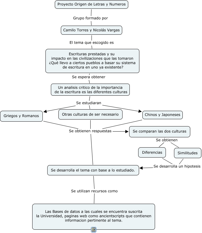 Este Cmap, tiene información relacionada con: Origen de Letras y Numeros, Se desarrolla el tema con base a lo estudiado. Se utilizan recursos como Las Bases de datos a las cuales se encuentra suscrita la Universidad, paginas web como ancientscripts que contienen informacion pertinente al tema., Griegos y Romanos Se obtienen respuestas Se desarrolla el tema con base a lo estudiado., Se comparan las dos culturas Se obtienen Diferencias, Escrituras prestadas y su impacto en las civilizaciones que las tomaron ¿Qué llevo a ciertos pueblos a basar su sistema de escritura en uno ya existente? Se espera obtener Un analisis critico de la importancia de la escritura es las diferentes culturas, Chinos y Japoneses Se obtienen respuestas Se comparan las dos culturas, Otras culturas de ser necesario Se obtienen respuestas Se desarrolla el tema con base a lo estudiado., Griegos y Romanos Se obtienen respuestas Se comparan las dos culturas, Proyecto Origen de Letras y Numeros Grupo formado por Camilo Torres y Nicolás Vargas, Otras culturas de ser necesario Se obtienen respuestas Se comparan las dos culturas, Se comparan las dos culturas Se obtienen Similitudes, Un analisis critico de la importancia de la escritura es las diferentes culturas Se estudiaran Griegos y Romanos, Similitudes Se desarrolla un hipotesis Se desarrolla el tema con base a lo estudiado., Chinos y Japoneses Se obtienen respuestas Se desarrolla el tema con base a lo estudiado., Un analisis critico de la importancia de la escritura es las diferentes culturas Se estudiaran Chinos y Japoneses, Diferencias Se desarrolla un hipotesis Se desarrolla el tema con base a lo estudiado., Un analisis critico de la importancia de la escritura es las diferentes culturas Se estudiaran Otras culturas de ser necesario, Camilo Torres y Nicolás Vargas El tema que escogido es Escrituras prestadas y su impacto en las civilizaciones que las tomaron ¿Qué llevo a ciertos pueblos a basar su sistema de escritura en uno ya existente?