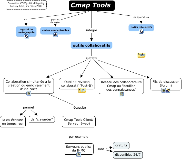 Cette carte conceptuelle, cree avec IHMC CmapTools, contient des informations liees a : Formation Cmap part3, Cmap Tools est logiciel de cartographie, Serveurs publics du IHMC sont gratuits, outils collaboratifs comme Outil de révision collaboratif (Post-It), Cmap Tools s'apprend via outils interactifs, Collaboration simultanée à la création ou enrichissement d'une carte permet de "clavarder", Collaboration simultanée à la création ou enrichissement d'une carte permet la co-écriture en temps réel, Cmap Tools intègre outils collaboratifs, outils collaboratifs comme Collaboration simultanée à la création ou enrichissement d'une carte, outils collaboratifs comme Fils de discussion (forum), outils collaboratifs comme Réseau des collaborateurs Cmap ou "bouillon des connaissances", Cmap Tools permet de créer cartes conceptuelles, Cmap Tools Client/ Serveur (web) par exemple Serveurs publics du IHMC, Collaboration simultanée à la création ou enrichissement d'une carte nécessite Cmap Tools Client/ Serveur (web), Serveurs publics du IHMC sont disponibles 24/7