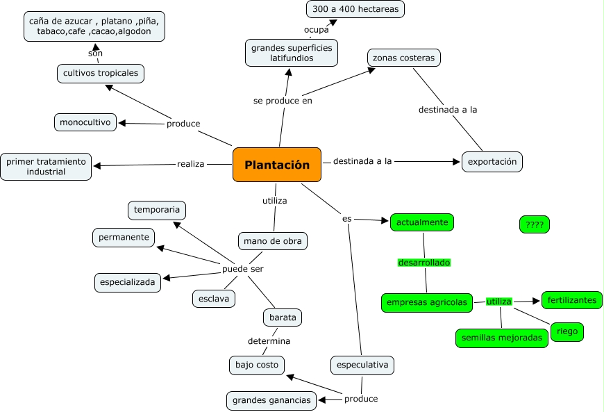 Este mapa conceptual tiene información relacionada a: Plantación 32 2009 tt, Plantación es actualmente, grandes superficies latifundios ocupa 300 a 400 hectareas, mano de obra puede ser esclava, cultivos tropicales son caña de azucar , platano ,piña, tabaco,cafe ,cacao,algodon, mano de obra puede ser permanente, Plantación se produce en grandes superficies latifundios, Plantación realiza primer tratamiento industrial, empresas agricolas utiliza semillas mejoradas, especulativa produce bajo costo, zonas costeras destinada a la exportación