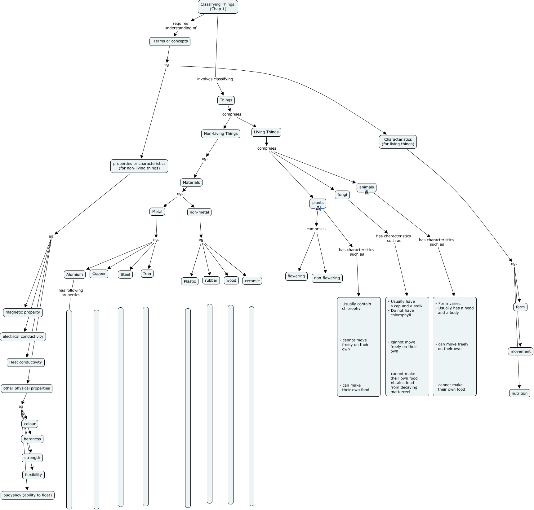 This Concept Map, created with IHMC CmapTools, has information related to: P6_C1_Classifying Things, other physical properties eg buoyancy (ability to float), non-metal eg. wood, Things comprises Living Things, Materials eg. Metal, other physical properties eg strength, Metal eg. Steel, other physical properties eg colour, properties or characteristics (for non-living things) eg. other physical properties, other physical properties eg hardness, Classifying Things (Chap 1) involves classifying Things, Living Things comprises fungi, plants comprises flowering, Non-Living Things eg. Materials, Living Things comprises plants, Terms or concepts eg properties or characteristics (for non-living things), Materials eg. non-metal, Metal eg. Copper, other physical properties eg flexibility, Characteristics (for living things) eg. movement, Living Things comprises animals
