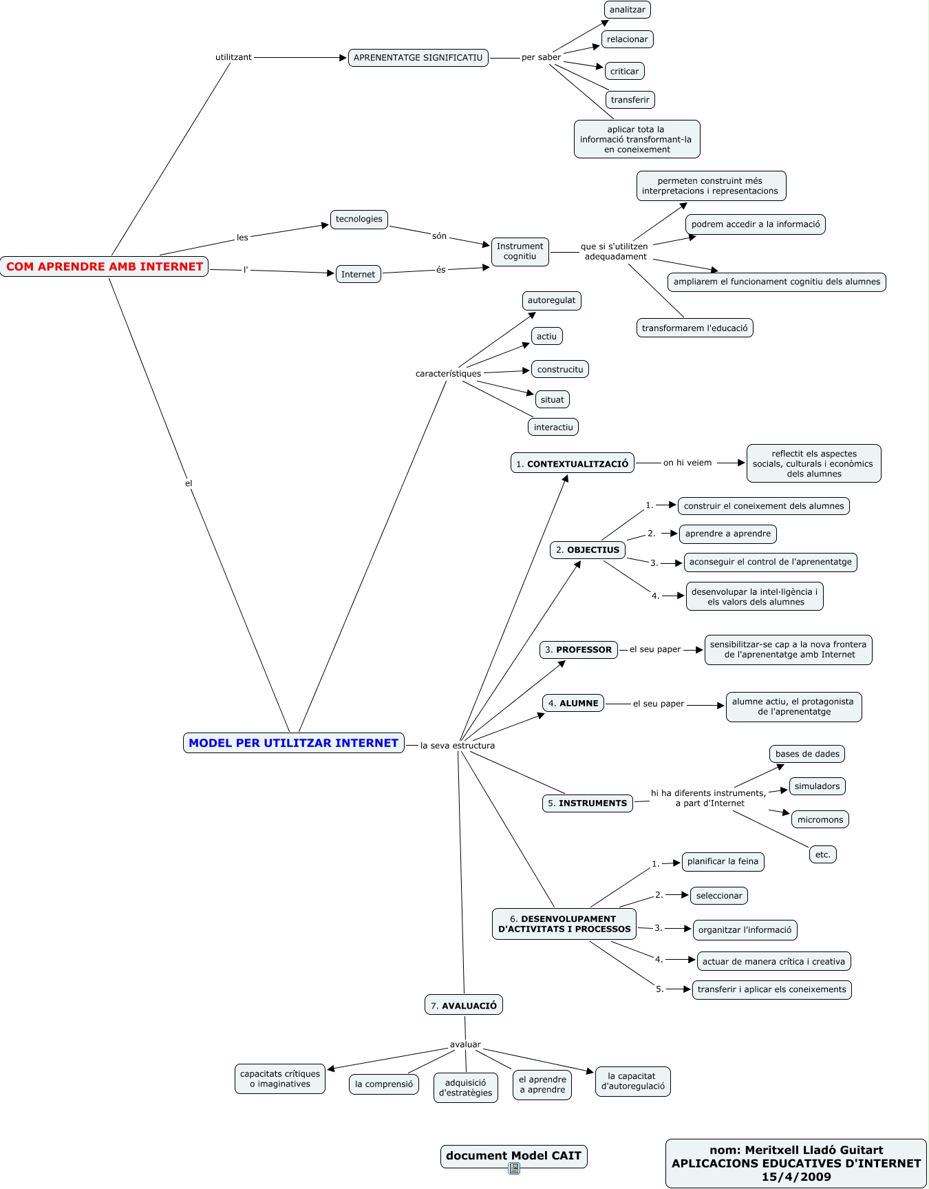 Este Cmap, tiene información relacionada con: Cmap Meritxell Lladó (aplicacions educatives d'Internet), MODEL PER UTILITZAR INTERNET característiques actiu, 4. ALUMNE el seu paper alumne actiu, el protagonista de l'aprenentatge, 3. PROFESSOR el seu paper sensibilitzar-se cap a la nova frontera de l'aprenentatge amb Internet, MODEL PER UTILITZAR INTERNET la seva estructura 6. DESENVOLUPAMENT D'ACTIVITATS I PROCESSOS, Instrument cognitiu que si s'utilitzen adequadament permeten construint més interpretacions i representacions, 7. AVALUACIÓ avaluar el aprendre a aprendre, MODEL PER UTILITZAR INTERNET la seva estructura 7. AVALUACIÓ, APRENENTATGE SIGNIFICATIU per saber transferir, MODEL PER UTILITZAR INTERNET la seva estructura 3. PROFESSOR, APRENENTATGE SIGNIFICATIU per saber analitzar, 6. DESENVOLUPAMENT D'ACTIVITATS I PROCESSOS 4. actuar de manera crítica i creativa, MODEL PER UTILITZAR INTERNET la seva estructura 1. CONTEXTUALITZACIÓ, 6. DESENVOLUPAMENT D'ACTIVITATS I PROCESSOS 5. transferir i aplicar els coneixements, MODEL PER UTILITZAR INTERNET característiques autoregulat, 7. AVALUACIÓ avaluar capacitats crítiques o imaginatives, 6. DESENVOLUPAMENT D'ACTIVITATS I PROCESSOS 3. organitzar l'informació, 2. OBJECTIUS 1. construir el coneixement dels alumnes, MODEL PER UTILITZAR INTERNET característiques interactiu, MODEL PER UTILITZAR INTERNET la seva estructura 4. ALUMNE, 2. OBJECTIUS 3. aconseguir el control de l'aprenentatge