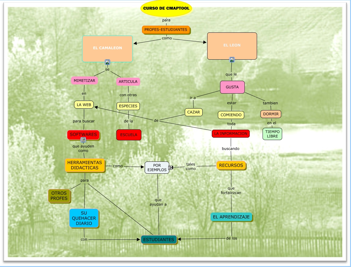 Este Cmap, tiene información relacionada con: EL CAMALEON Y EL LEON, EL CAMALEON se MIMETIZAR, ESPECIES de la ESCUELA, SOFTWARES que ayuden como HERRAMIENTAS DIDACTICAS, HERRAMIENTAS DIDACTICAS para ESTUDIANTES, POR EJEMPLOS que ayudan a ESTUDIANTES, PROFES-ESTUDIANTES como EL LEON, CAZAR de LA WEB, LA INFORMACION buscando RECURSOS, SU QUEHACER DIARIO con ESTUDIANTES, GUSTA ir a CAZAR, DORMIR en el TIEMPO LIBRE, GUSTA tambien DORMIR, LA WEB para buscar SOFTWARES, HERRAMIENTAS DIDACTICAS para SU QUEHACER DIARIO, RECURSOS tales como POR EJEMPLOS, RECURSOS que fortalezcan EL APRENDIZAJE, GUSTA estar COMIENDO, CURSO DE CMAPTOOL para PROFES-ESTUDIANTES, PROFES-ESTUDIANTES como EL CAMALEON, ARTICULA con otras ESPECIES