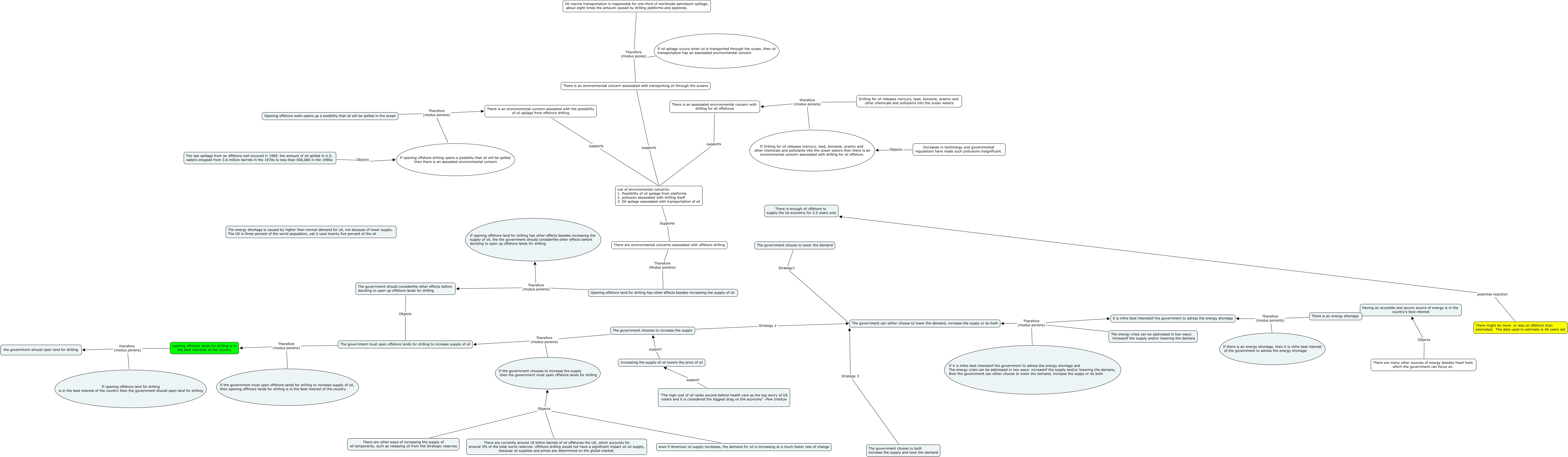 This Concept Map, created with IHMC CmapTools, has information related to: US_drill_final, Drilling for oil releases mercury, lead, benzene, arsenic and other chemicals and pollutants into the ocean waters therefore (modus ponens) There is an assosiated environmental concern with drilling for oil offshores, The government chooses to increase the supply Therefore (modus ponens) The government must open offshore lands for drilling to increase supply of oil, "The high cost of oil ranks second behind health care as the top worry of US voters and it is considered the biggest drag on the economy" -Pew Institue support Increasing the supply of oil lowers the price of oil, There are environmental concerns assosiated with offshore drilling Therefore (Modus ponens) Opening offshore land for drilling has other effects besides increasing the supply of oil, The government choose to both increase the supply and lowe the demand Strategy 3 The government can either choose to lower the demand, increase the suppy or do both, If opening offshore drilling opens a posibility that oil will be spilled then there is an assoaited environmental concern Therefore (modus ponens) There is an environmental concern assoaited with the possibility of oil spilage from offshore drilling, List of environmental concerns: 1. Possibility of oil spilage from platforms 2. pollusion assosiated with drilling itself 3. Oil spilage assosiated with transportation of oil Supports There are environmental concerns assosiated with offshore drilling, The government chooses to increase the supply Therefore (modus ponens) If the government chooses to increase the supply then the government must open offshore lands for drilling, If oil spliage occurs when oil is transported through the ocean, then oil transportation has an assosiated environmental concern Therefore (modus pones) There is an environmental concern assosiated with transporting oil through the oceans, There are currently around 18 billion barrels of oil offshores the US, which accounts for around 3% of the total world reserves. offshore drilling would not have a significant impact on oil supply, because oil supplies and prices are determined on the global market. Objects If the government chooses to increase the supply then the government must open offshore lands for drilling, There is an energy shortage Therefore (modus ponents) it is inthe best interestof the government to adress the energy shortage, The energy crisis can be addressed in two ways: increasinf the supply and/or lowering the demans Therefore (modus ponens) it is inthe best interestof the government to adress the energy shortage, The government should considerthe other effects before deciding to open up offshore lands for drilling Objects The government must open offshore lands for drilling to increase supply of oil, The government choose to lower the demand Strategy1 The government can either choose to lower the demand, increase the suppy or do both, If Drilling for oil releases mercury, lead, benzene, arsenic and other chemicals and pollutants into the ocean waters then there is an environmental concern assosiated with drilling for oil offshore. therefore (modus ponens) There is an assosiated environmental concern with drilling for oil offshores, Opening offshore land for drilling has other effects besides increasing the supply of oil Therefore (modus ponens) The government should considerthe other effects before deciding to open up offshore lands for drilling, The government must open offshore lands for drilling to increase supply of oil Therefore (modus ponens) If the government must open offshore lands for drilling to increase supply of oil, then opening offhosre lands for drilling is in the best interest of the country, If opening offshore land for drilling is in the best interest of the country then the government should open land for drilling therefore (modus ponens) the government should open land for drilling, The government chooses to increase the supply Strategy 2 The government can either choose to lower the demand, increase the suppy or do both, The energy crisis can be addressed in two ways: increasinf the supply and/or lowering the demans Therefore (modus ponens) If it is inthe best interestof the government to adress the energy shortage and The energy crisis can be addressed in two ways: increasinf the supply and/or lowering the demans, then the government can either choose to lower the demand, increase the suppy or do both