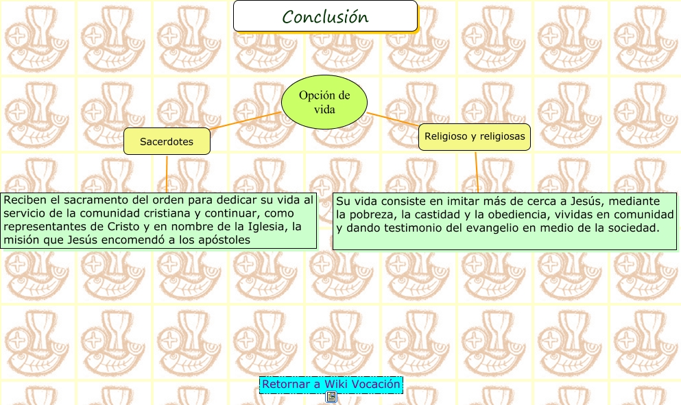 Este Cmap, tiene información relacionada con: CONCLUSION SOBRE LE SACERDOCIO Y LA VIDA RELIGIOSA, Opción de vida ???? Religioso y religiosas, Sacerdotes ???? Reciben el sacramento del orden para dedicar su vida al servicio de la comunidad cristiana y continuar, como representantes de Cristo y en nombre de la Iglesia, la misión que Jesús encomendó a los apóstoles, Opción de vida ???? Sacerdotes, Religioso y religiosas ???? Su vida consiste en imitar más de cerca a Jesús, mediante la pobreza, la castidad y la obediencia, vividas en comunidad y dando testimonio del evangelio en medio de la sociedad., Opción de vida ???? Religioso y religiosas