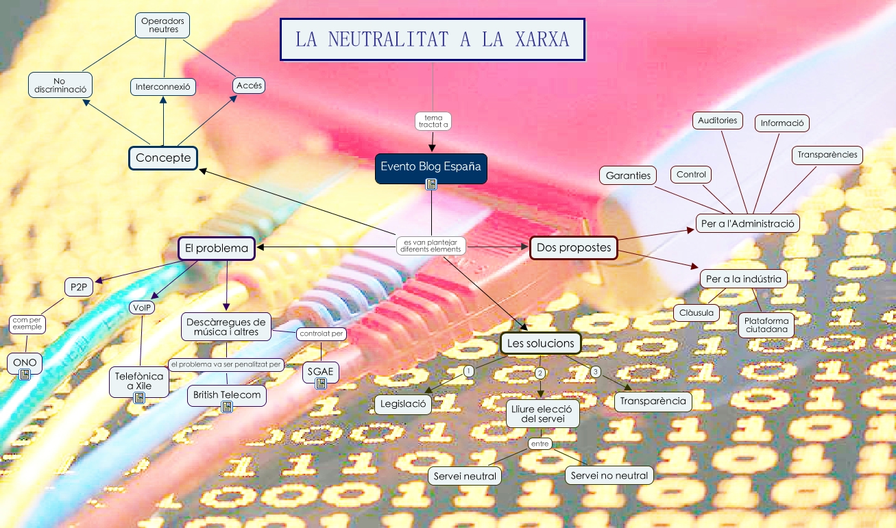 Este mapa conceptual tiene información relacionada a: NX, ???? Interconnexió, Per a l'Administració ???? Garanties, Per a l'Administració ???? Transparències, Per a l'Administració ???? Control, Concepte ???? Interconnexió, Evento Blog España es van plantejar diferents elements Dos propostes, No discriminació ???? , P2P com per exemple ONO, Per a la indústria ???? Clàusula, Descàrregues de música i altres controlat per SGAE