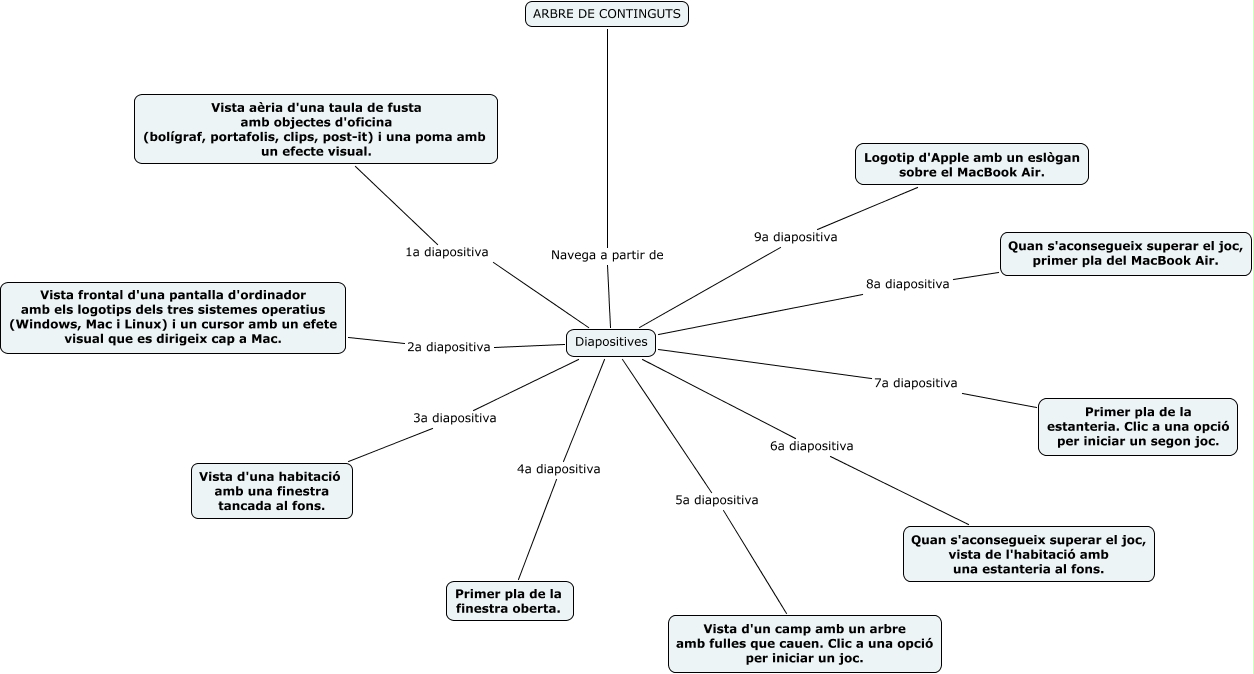 Este Cmap, tiene información relacionada con: Arbre de continguts pràctica 2, Diapositives 7a diapositiva Primer pla de la estanteria. Clic a una opció per iniciar un segon joc., Diapositives 3a diapositiva Vista d'una habitació amb una finestra tancada al fons., Diapositives 5a diapositiva Vista d'un camp amb un arbre amb fulles que cauen. Clic a una opció per iniciar un joc., Diapositives 9a diapositiva Logotip d'Apple amb un eslògan sobre el MacBook Air., Diapositives 6a diapositiva Quan s'aconsegueix superar el joc, vista de l'habitació amb una estanteria al fons., Diapositives 8a diapositiva Quan s'aconsegueix superar el joc, primer pla del MacBook Air., Diapositives 4a diapositiva Primer pla de la finestra oberta., ARBRE DE CONTINGUTS Navega a partir de Diapositives, Diapositives 1a diapositiva Vista aèria d'una taula de fusta amb objectes d'oficina (bolígraf, portafolis, clips, post-it) i una poma amb un efecte visual., Diapositives 2a diapositiva Vista frontal d'una pantalla d'ordinador amb els logotips dels tres sistemes operatius (Windows, Mac i Linux) i un cursor amb un efete visual que es dirigeix cap a Mac.
