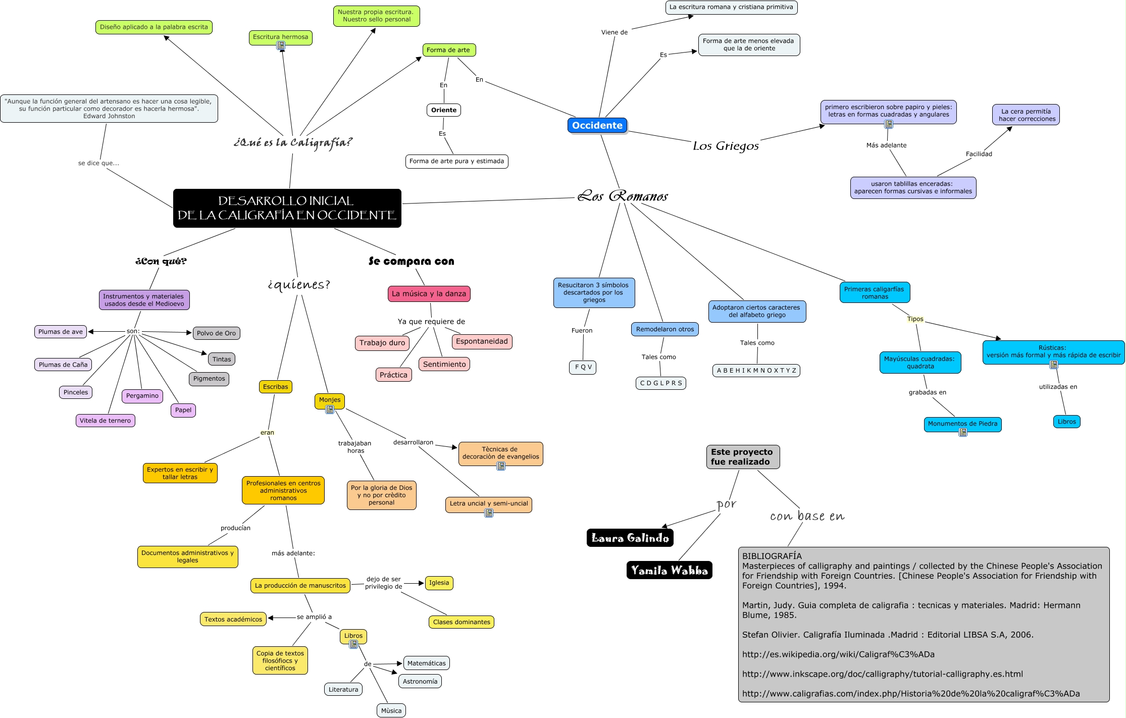 Este Cmap, tiene información relacionada con: caligrafia final, Instrumentos y materiales usados desde el Medioevo son: Polvo de Oro, Forma de arte En Occidente, Adoptaron ciertos caracteres del alfabeto griego Tales como A B E H I K M N O X T Y Z, Instrumentos y materiales usados desde el Medioevo son: Tintas, La producción de manuscritos se amplió a Copia de textos filosófiocs y científicos, Instrumentos y materiales usados desde el Medioevo son: Vitela de ternero, DESARROLLO INICIAL DE LA CALIGRAFÍA EN OCCIDENTE ¿Qué es la Caligrafía? Nuestra propia escritura. Nuestro sello personal, Instrumentos y materiales usados desde el Medioevo son: Pinceles, Occidente Viene de La escritura romana y cristiana primitiva, Remodelaron otros Tales como C D G L P R S, Libros de Literatura, DESARROLLO INICIAL DE LA CALIGRAFÍA EN OCCIDENTE ¿Qué es la Caligrafía? Diseño aplicado a la palabra escrita, Primeras caligarfías romanas Tipos Mayúsculas cuadradas: quadrata, Libros de Matemáticas, Escribas eran Expertos en escribir y tallar letras, DESARROLLO INICIAL DE LA CALIGRAFÍA EN OCCIDENTE ¿Con qué? Instrumentos y materiales usados desde el Medioevo, DESARROLLO INICIAL DE LA CALIGRAFÍA EN OCCIDENTE Los Romanos Primeras caligarfías romanas, Occidente Los Romanos Remodelaron otros, Monjes desarrollaron Letra uncial y semi-uncial, La producción de manuscritos se amplió a Libros