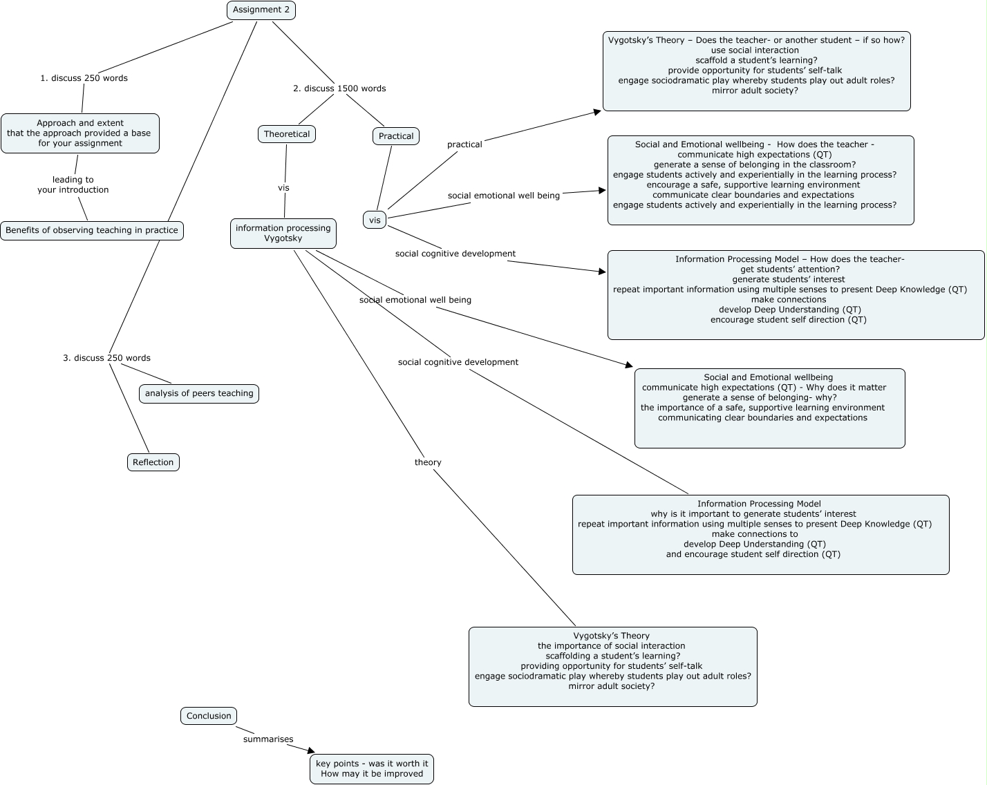 This Concept Map, created with IHMC CmapTools, has information related to: Assignment 2 outline, vis social emotional well being Social and Emotional wellbeing - How does the teacher - communicate high expectations (QT) generate a sense of belonging in the classroom? engage students actively and experientially in the learning process? encourage a safe, supportive learning environment communicate clear boundaries and expectations engage students actively and experientially in the learning process?, information processing Vygotsky social cognitive development Information Processing Model why is it important to generate students’ interest repeat important information using multiple senses to present Deep Knowledge (QT) make connections to develop Deep Understanding (QT) and encourage student self direction (QT), vis social cognitive development Information Processing Model – How does the teacher- get students’ attention? generate students’ interest repeat important information using multiple senses to present Deep Knowledge (QT) make connections develop Deep Understanding (QT) encourage student self direction (QT), Assignment 2 1. discuss 250 words Approach and extent that the approach provided a base for your assignment, Conclusion summarises key points - was it worth it How may it be improved, Approach and extent that the approach provided a base for your assignment leading to your introduction Benefits of observing teaching in practice, vis practical Vygotsky’s Theory – Does the teacher- or another student – if so how? use social interaction scaffold a student’s learning? provide opportunity for students’ self-talk engage sociodramatic play whereby students play out adult roles? mirror adult society?, Assignment 2 3. discuss 250 words Reflection, information processing Vygotsky social emotional well being Social and Emotional wellbeing communicate high expectations (QT) - Why does it matter generate a sense of belonging- why? the importance of a safe, supportive learning environment communicating clear boundaries and expectations, information processing Vygotsky theory Vygotsky’s Theory the importance of social interaction scaffolding a student’s learning? providing opportunity for students’ self-talk engage sociodramatic play whereby students play out adult roles? mirror adult society?, Theoretical vis information processing Vygotsky, Assignment 2 2. discuss 1500 words Practical, Assignment 2 2. discuss 1500 words Theoretical, Practical ???? vis, Assignment 2 3. discuss 250 words analysis of peers teaching