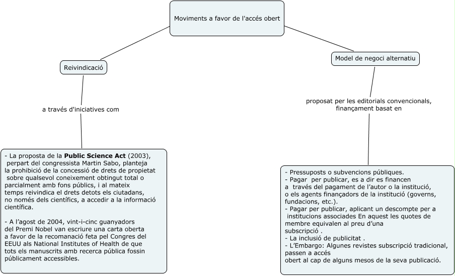 Este mapa conceptual tiene información relacionada a: Fronts a favor mapa conceptual, Model de negoci alternatiu proposat per les editorials convencionals, finançament basat en - Pressuposts o subvencions públiques. - Pagar per publicar, es a dir es financen a través del pagament de l’autor o la institució, o els agents finançadors de la institució (governs, fundacions, etc.). - Pagar per publicar, aplicant un descompte per a institucions associades En aquest les quotes de membre equivalen al preu d’una subscripció . - La inclusió de publicitat . - L’Embargo: Algunes revistes subscripció tradicional, passen a accés obert al cap de alguns mesos de la seva publicació., Moviments a favor de l'accés obert ???? Model de negoci alternatiu, Moviments a favor de l'accés obert ???? Reivindicació, Reivindicació a través d'iniciatives com - La proposta de la Public Science Act (2003), perpart del congressista Martin Sabo, planteja la prohibició de la concessió de drets de propietat sobre qualsevol coneixement obtingut total o parcialment amb fons públics, i al mateix temps reivindica el drets detots els ciutadans, no només dels científics, a accedir a la informació científica. - A l’agost de 2004, vint-i-cinc guanyadors del Premi Nobel van escriure una carta oberta a favor de la recomanació feta pel Congres del EEUU als National Institutes of Health de que tots els manuscrits amb recerca pública fossin públicament accessibles.