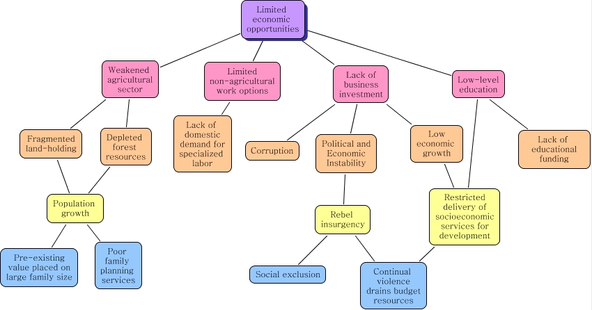 This Concept Map, created with IHMC CmapTools, has information related to: Nepal Problem Tree, Lack of business investment Low economic growth, Pre-existing value placed on large family size Population growth, Lack of educational funding Low-level education, Limited non-agricultural work options Limited economic opportunities, Rebel insurgency Continual violence drains budget resources, Limited economic opportunities Low-level education, Restricted delivery of socioeconomic services for development Low economic growth, Limited economic opportunities Weakened agricultural sector, Fragmented land-holding Weakened agricultural sector, Limited economic opportunities Lack of business investment, Poor family planning services Population growth, Continual violence drains budget resources Restricted delivery of socioeconomic services for development, Fragmented land-holding Population growth, Weakened agricultural sector Depleted forest resources, Restricted delivery of socioeconomic services for development Low-level education, Limited non-agricultural work options Lack of domestic demand for specialized labor, Population growth Depleted forest resources, Lack of business investment Political and Economic Instability, Rebel insurgency Social exclusion, Political and Economic Instability Rebel insurgency