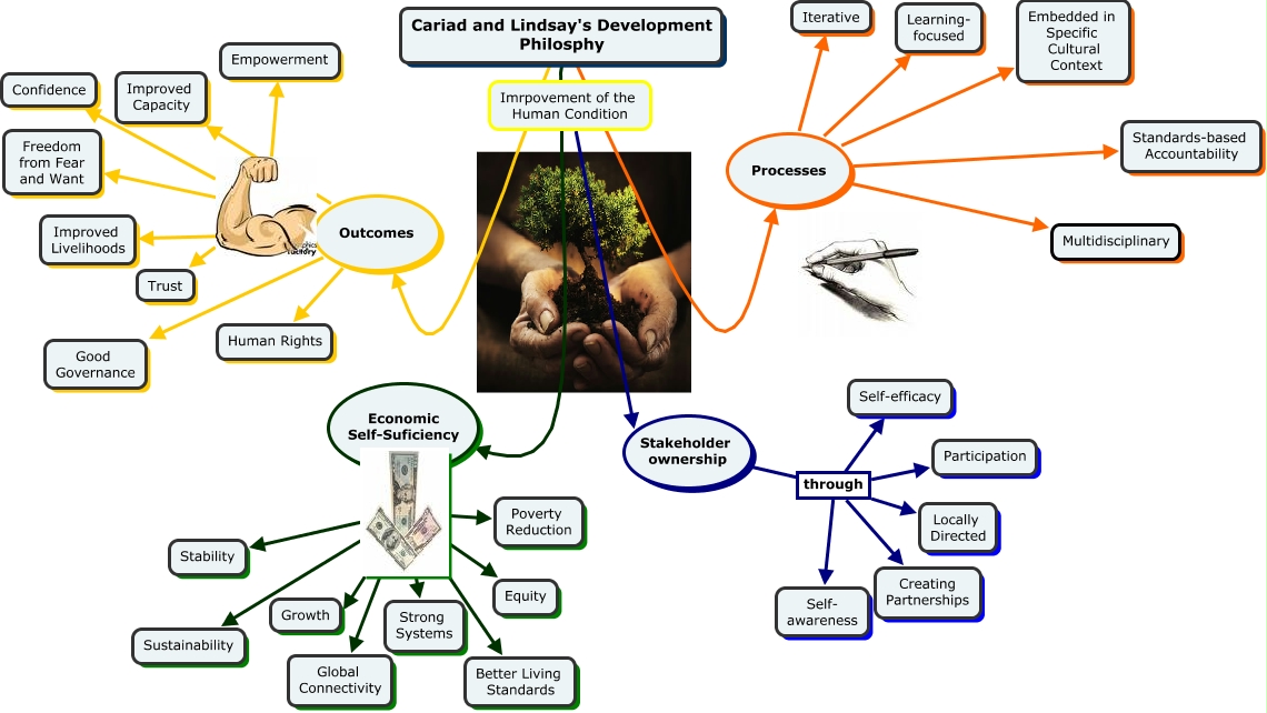 This Concept Map, created with IHMC CmapTools, has information related to: Cariad and Lindsay's Development Philosophy, Stakeholder ownership through Self- awareness, Outcomes Good Governance, Cariad and Lindsay's Development Philosphy Processes, Economic Self-Suficiency, Processes Learning- focused, Processes Embedded in Specific Cultural Context, Processes Standards-based Accountability, Outcomes Human Rights, Stakeholder ownership through Participation, Processes Iterative, Growth, Stakeholder ownership through Creating Partnerships, Confidence, Cariad and Lindsay's Development Philosphy Outcomes, Equity, Stakeholder ownership through Locally Directed, Outcomes Improved Capacity, ???? Economic Self-Suficiency, Stability, Poverty Reduction